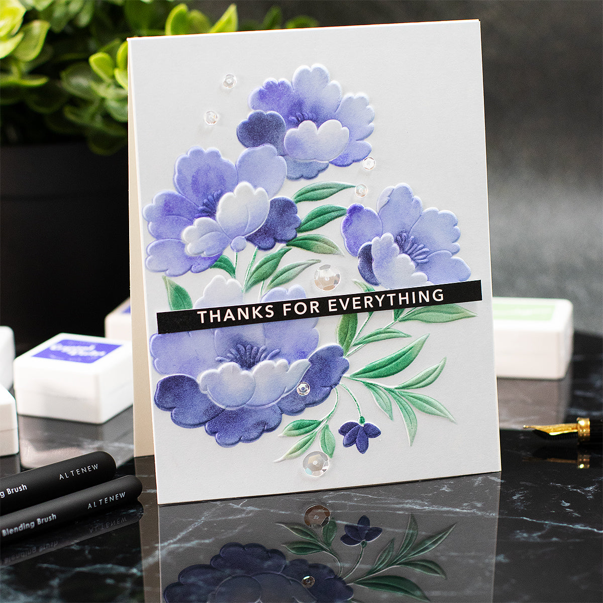 The 4 in 1 Soft Blossoms Simple Coloring Stencil Set coordinates with the Soft Blossoms Stamp Set and Soft Blossoms 3D Embossing Folder. It will help you add color to the matching stamp and embossing folder. Simply align the petals and leaves, and blend in colors in your favorite shades of ink.