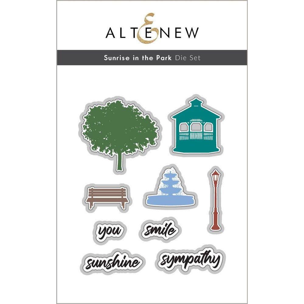 The Altenew Sunrise in the Park Die Set has been designed to coordinate with the Sunrise in the Park Stamp Set and comprises nine dies. The dimensions of the individual dies are as follows: Tree - 2.3 x 2.1 inches, Lamp - 2.6 x 1.8 inches, Fountain - 1.4 x 1.2 inches, Bench - 1.3 x 0.7 inches, Gazebo - 1.5 x 1.6 inches, you Shadow - 1.8 x 0.5 inches, smile Shadow - 1.1 x 0.6 inches, sunshine Shadow - 1.7 x 0.6 inches, and sympathy Shadow - 1.9 x 0.7 inches. With these dies, you can easily create stunning and intricate park scenes for your paper crafting projects.