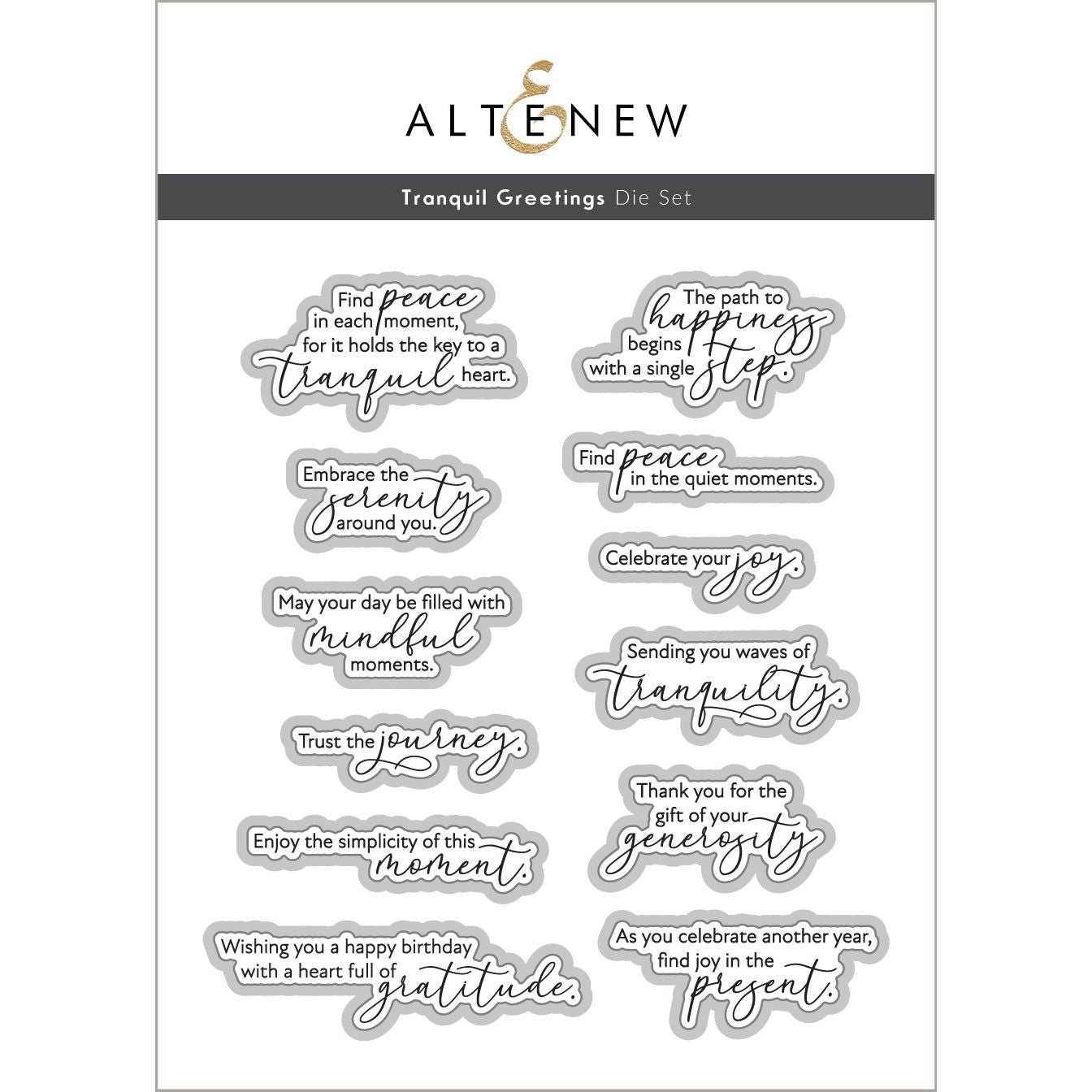 The Altenew Tranquil Greetings Dies perfectly coordinate with the Tranquil Greetings Clear Stamps ALT8948 and cut out the 12 sentiments included in the set. There are 12 dies in this set.