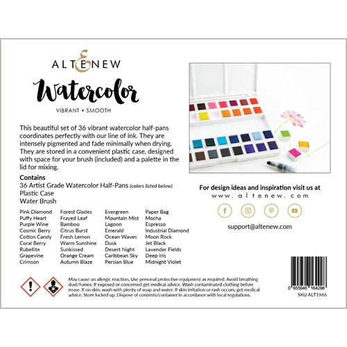 This beautiful set of 36 vibrant watercolor half-pans coordinates perfectly with Altenew's line of ink. They are intensely pigmented, fade minimally when drying, and some colors have lovely granulating effects.