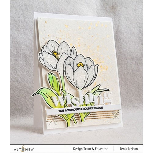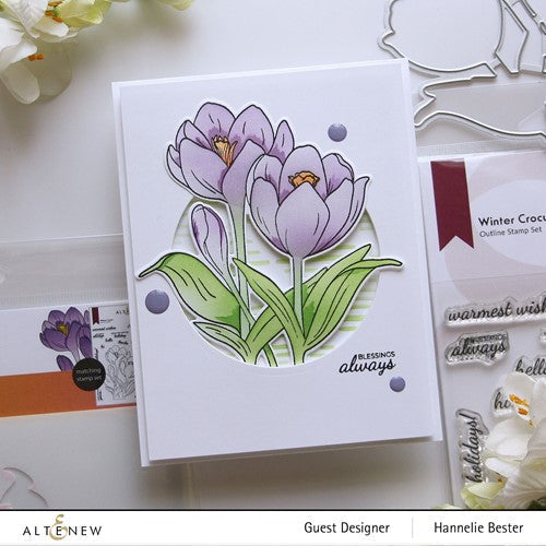 Embellish your projects with this lovely bunch of crocus flowers and sentiments just in time for the holiday season! This stamp set features a charming cluster of crocus flowers and 12 complementary sentiments to add that perfect finishing touch!