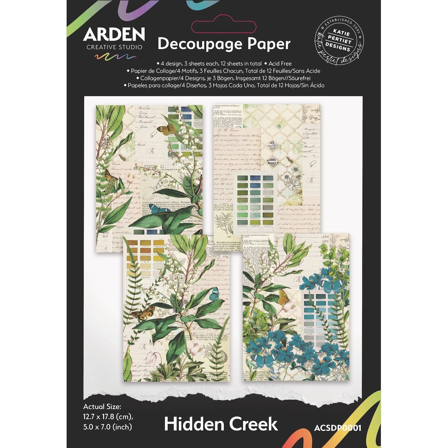 The Arden Creative Studio Decoupage Paper is part of the Hidden Creek Collection, designed by Katie Pertiet. This set includes 12 high-quality sheets (approximately 5 x 7 inches), featuring four unique designs with three sheets of each. Katie’s distinctive, vintage-inspired artistry adds intricate detail and charm, making these papers perfect for scrapbook pages, cards, journals, planners, and home decor. Designs showcase collages of foliage, handwritten text, color swatches, flowers, butterflies, quatrefoil, and other botanical elements. Ideal for mixed media, DIY, and paper crafting projects, these versatile papers allow you to effortlessly layer textures, create focal points, and add depth to your creative designs.