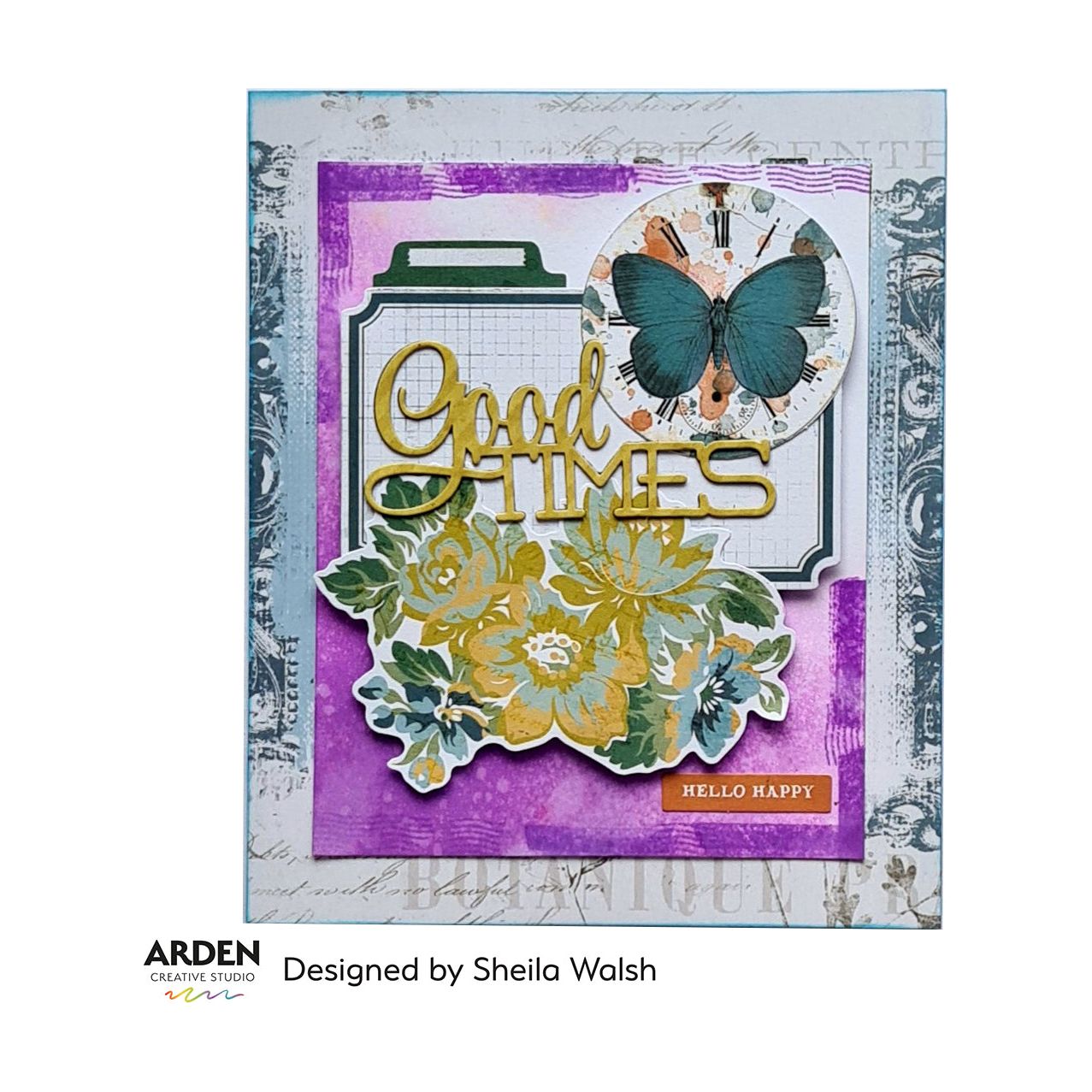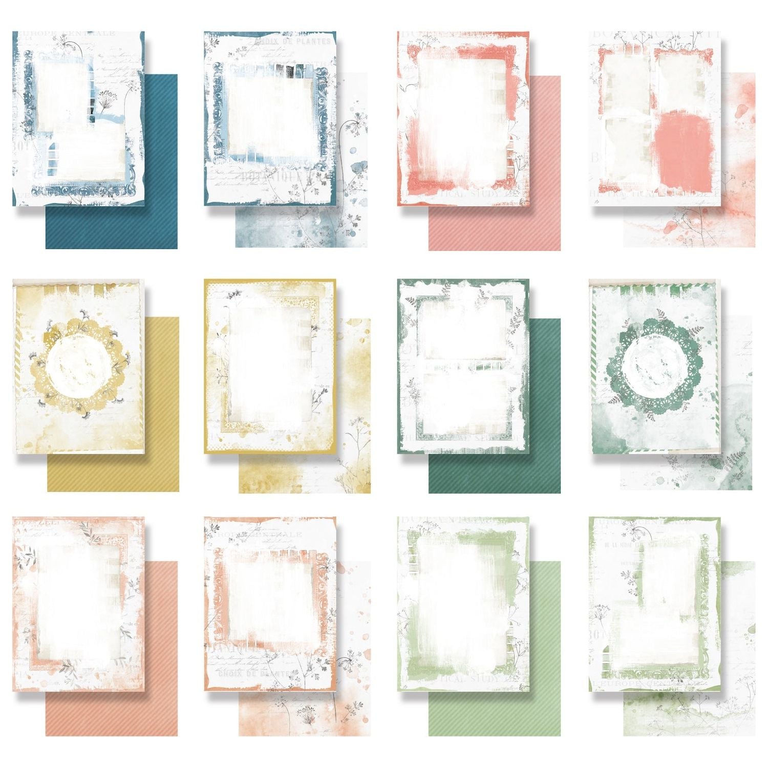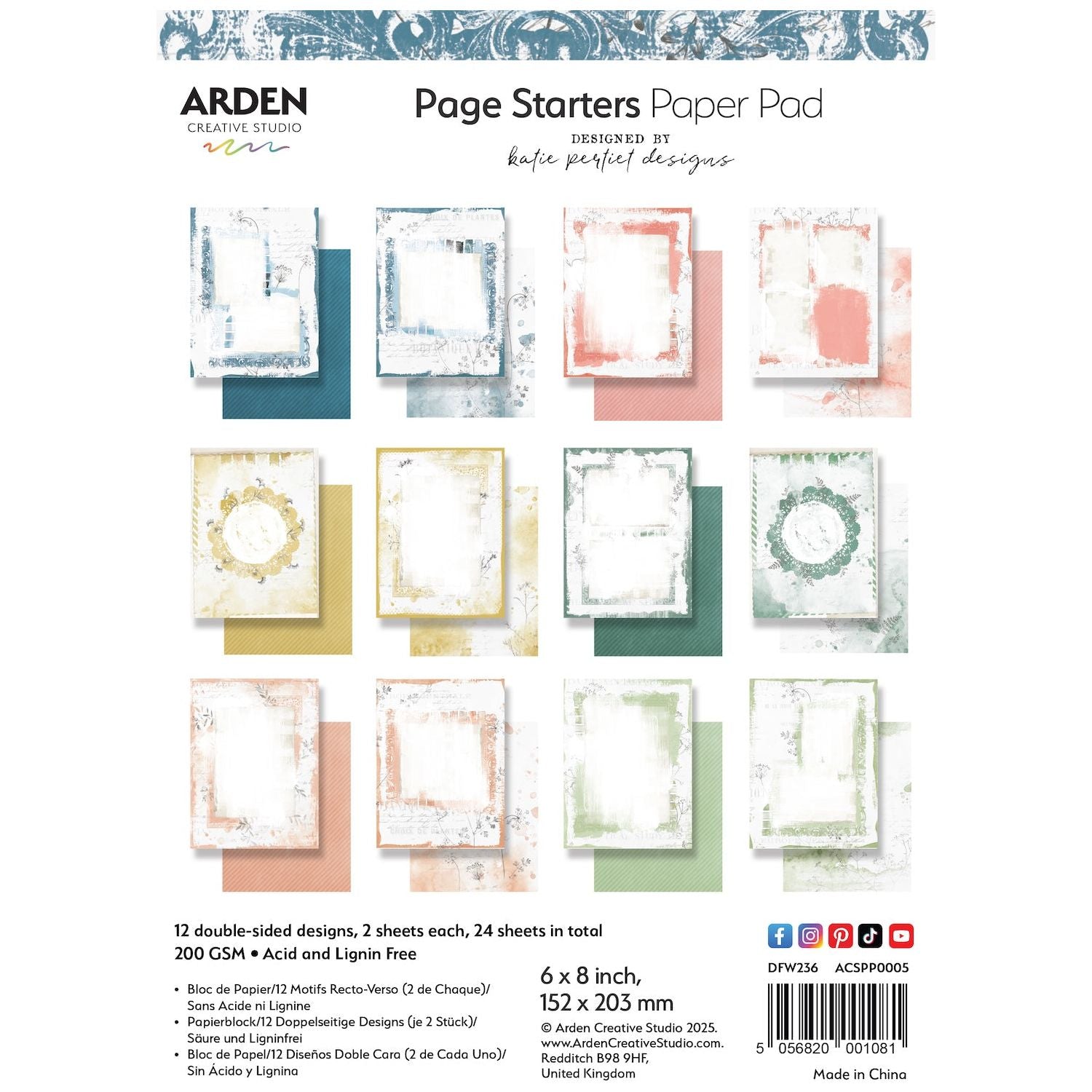 Arden Creative Studio Page Starters Paper Pad was designed by Katie Pertiet for the Page Starters Collection. This 6 x 8-inch paper pad includes 24 sheets total—12 double-sided designs with 2 sheets of each. Printed on 200gsm, acid and lignin-free paper, the pad features distressed collages of frames, wildflowers, and handwriting, as well as coordinating solid colors with white diagonal stripes. The color palette includes blues, greens, pinks, and yellows, offering a versatile base for scrapbook layouts, journals, and mixed media projects.
