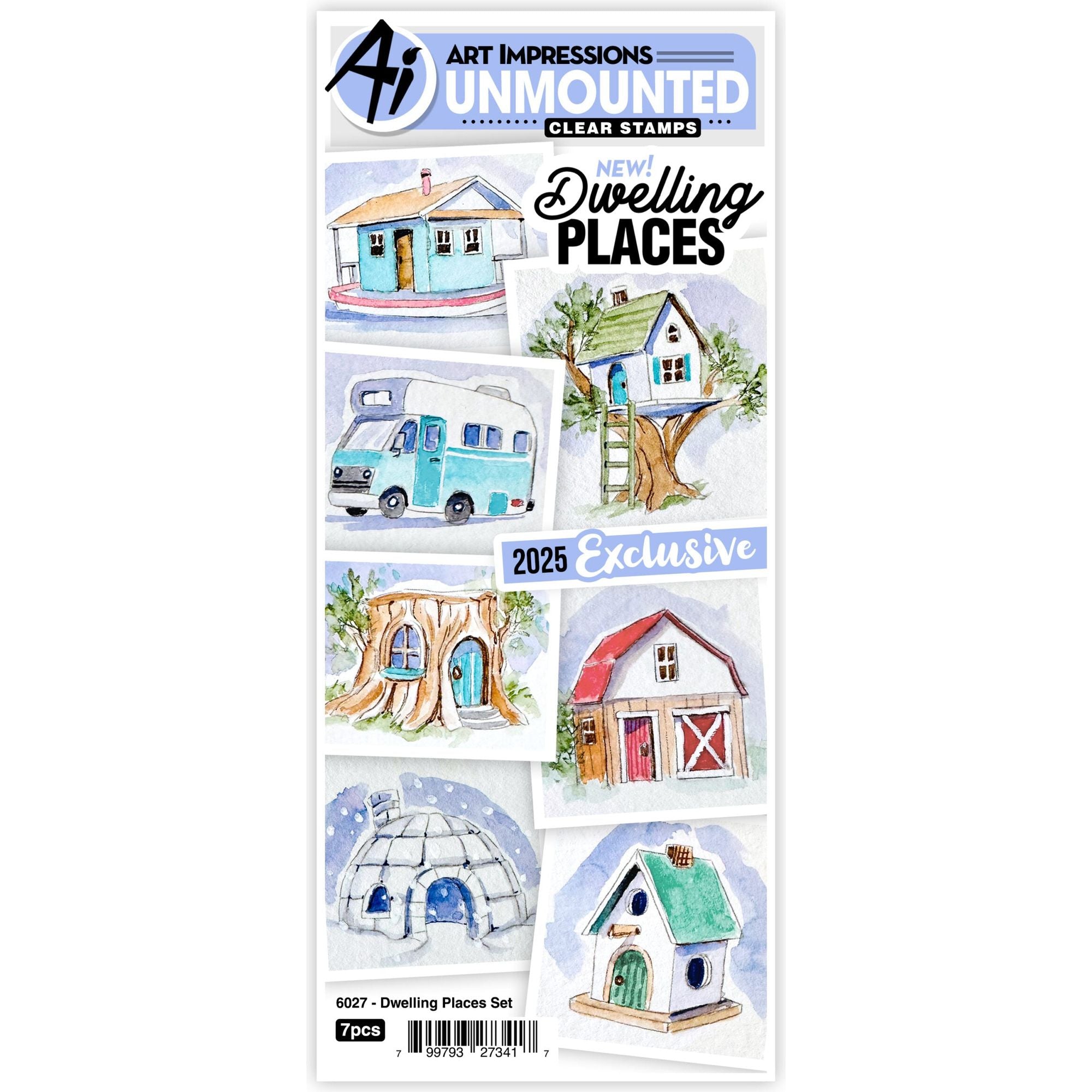 Embrace your creativity with Art Impressions Dwelling Places Stamps 6027. This 7-piece set includes a houseboat, camper, tree house, barn, birdhouse, igloo, and gnome home for quick and cute scenes. Add the Dwelling Accessory pieces for the ultimate in cuteness. Experience the whimsy and charm of these stamps in your crafts. Approximate dimensions are in inches: