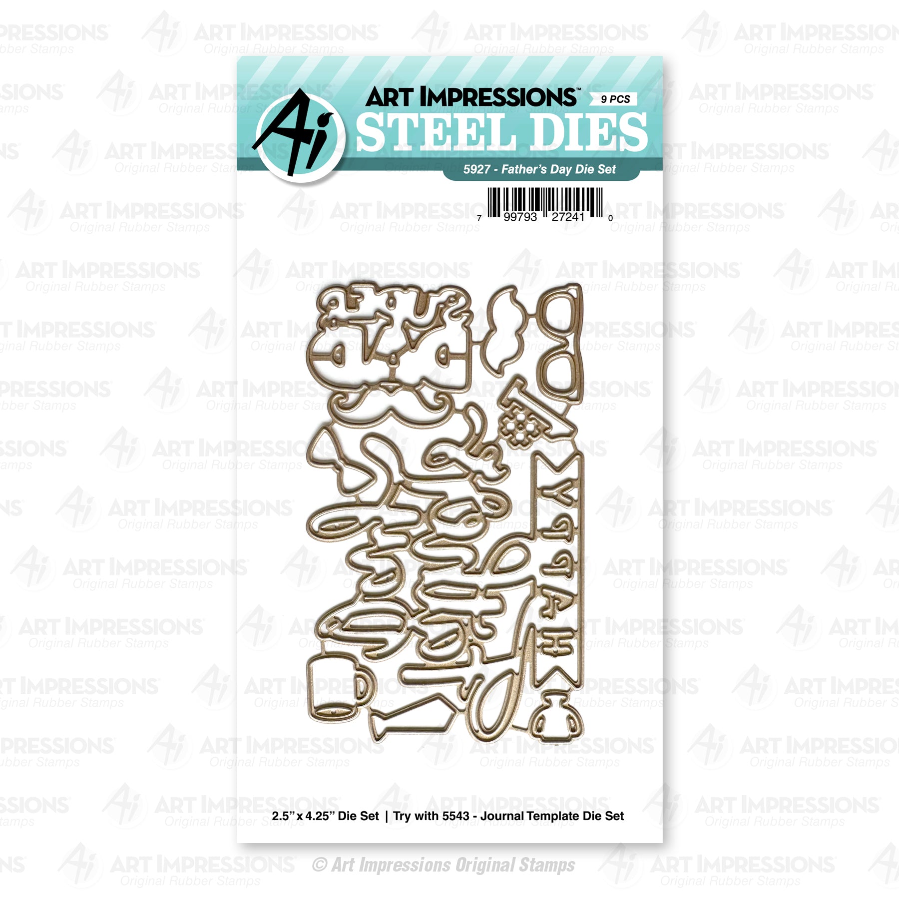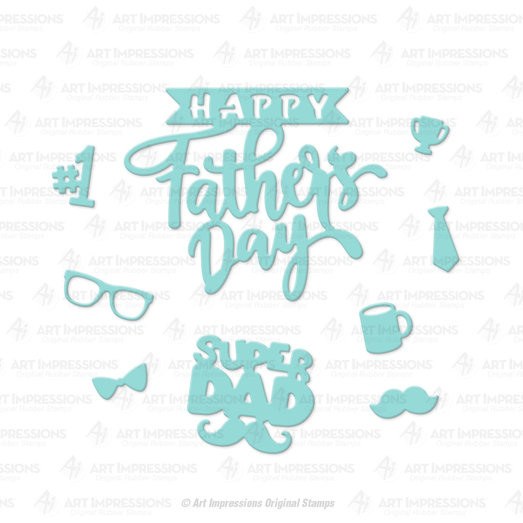 Celebrate Father's Day with a smile and a wink! This Art Impressions die set includes a playful banner and cursive 'Happy Father's Day' sentiment (measures approximately 2.5 x 2.5 inches), along with 'Super Dad' (measures approximately 1.5 x 1.25 inches) and fun icons like a trophy, neck tie, and mug. Show Dad he's #1 with this quirky and unique set! Die set measures approximately 4.25 x 2.5 inches.
