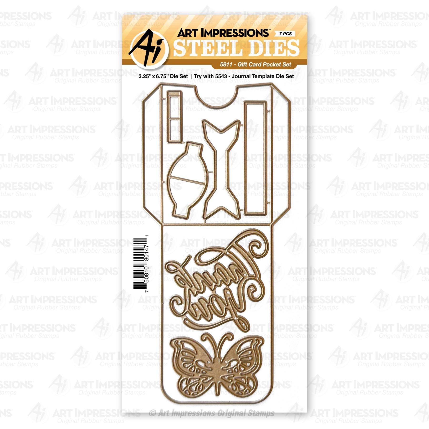 The Art Impressions Gift Card Pocket Journal Template Die Set 5811 features a 7 piece die set that includes a pocket die for gift cards, as well as a bow tie, butterfly, and 'Thank You' sentiment. This set is perfect for use with full size Journals from Art Impressions, allowing you to easily add pockets and decorative elements to your journaling projects. Get creative and add a personal touch to your gift cards and journals with this versatile and high-quality die set. Overall die set is approximately 3.2 x 6.75 inches. Pocket assembled is approximately 3.75 x 2.25 inches.