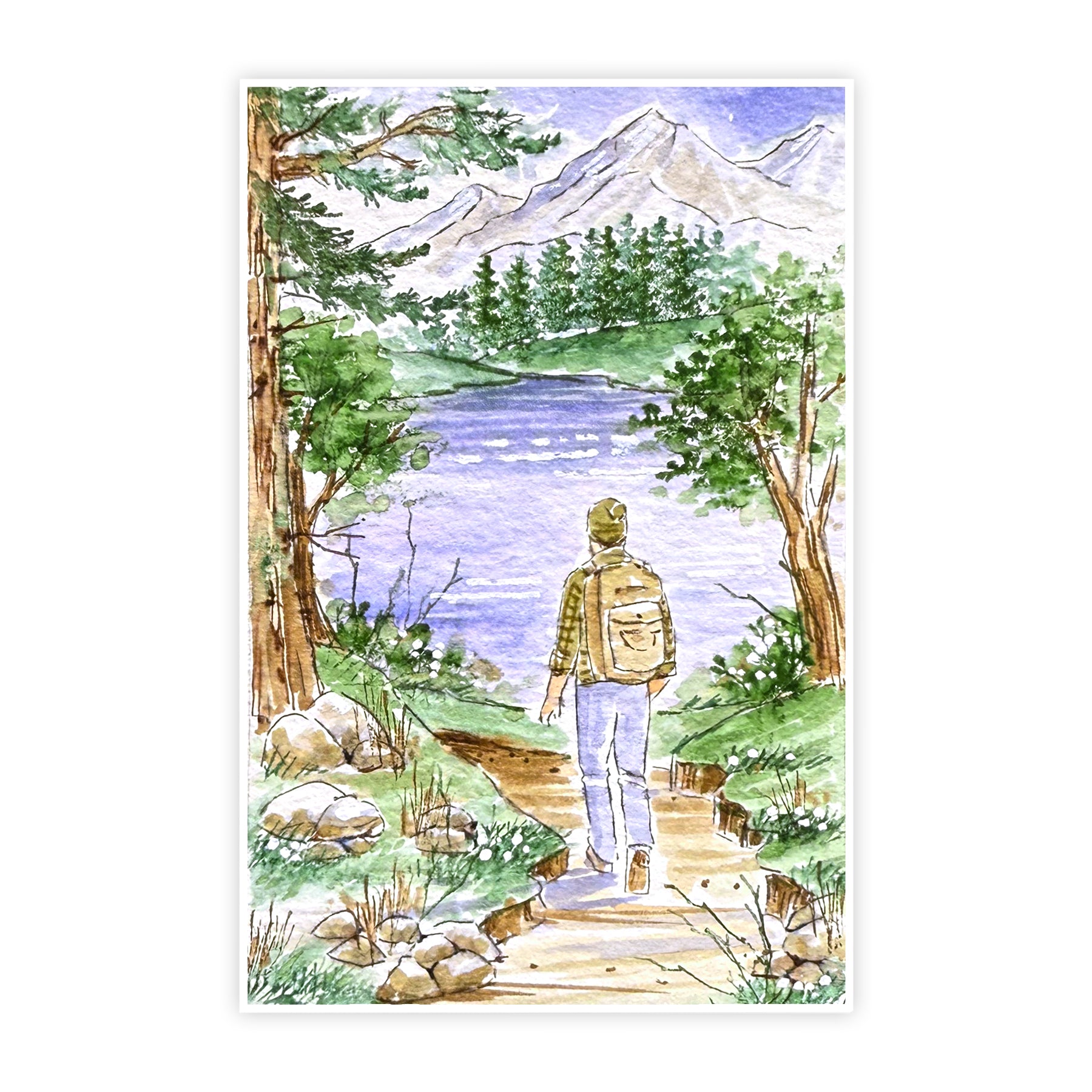 This single-piece Clear Stamp Set features a meticulously designed Watercolor Foundation image depicting a hiker traversing wilderness terrain with a serene lake backdrop. Measuring approximately 2.75 × 4 inches, this premium transparent stamp provides exceptional detail and precision for watercolor techniques, allowing for perfect positioning and layering in landscape-oriented paper crafting projects.