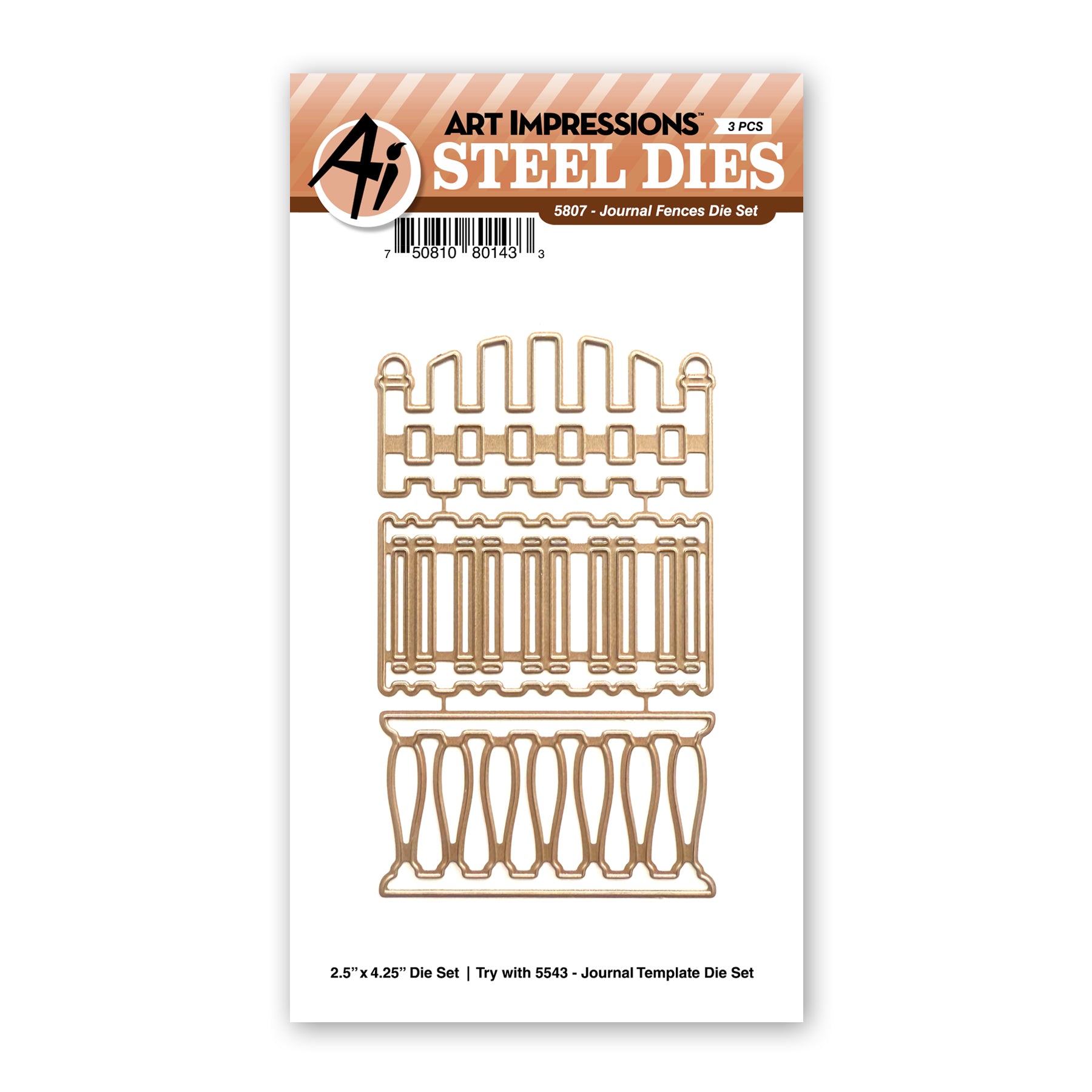 Create a charming outdoor scene in your journal with the Art Impressions Journal Fence Dies. This professional-quality 3-piece set includes fence and railing dies measuring approximately 2.5 x 4.25 inches. Perfectly sized for journal projects and designed to complement the Art Impressions Journal template set. These precision dies add dimensional architectural elements to enhance your creative paper crafting projects.