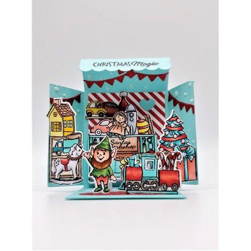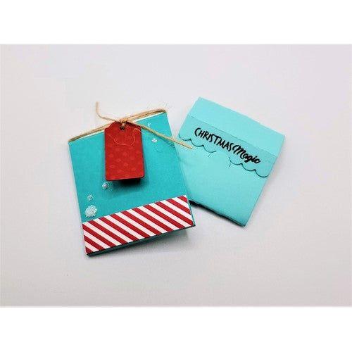 Matchbook Christmas Photopolymer Clear Stamp and Die Set. Stamp set is approximately 4x4 inches. Contains 16 pieces. Finished matchbook stands open at approximately 2.5 x 2.5 inches, folded up at 2x2 inches. Sentiments included in the set: Merry Christmas, Christmas Magic, Holly Jolly, and Tis the Season!