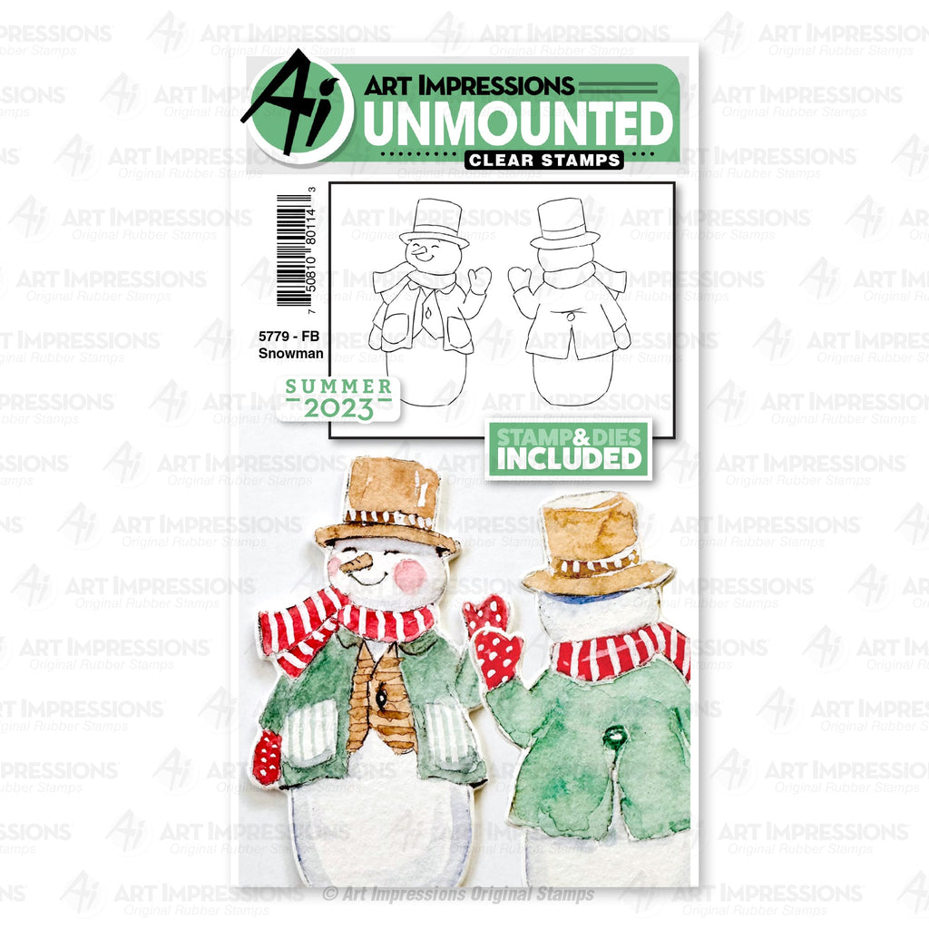 Create an eye-catching winter scene with the Art Impressions Snowman Front and Back Clear Stamp and Die Set 5779. This 4-piece set includes the front and back images of a snowman, as well as coordinating dies to help create a well-defined image. The stamp set measures approximately 2.75 x 3.75 inches. Bring a special winter charm to your card designs!