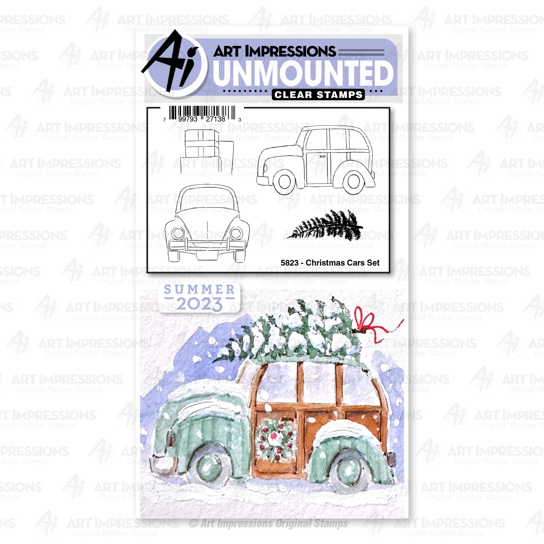 Bring the festive spirit to your crafts with this 4-piece Christmas car clear stamp set. The set includes a 3.75x3.75 inch image of a car facing forward, in profile, and a tree and gifts to place atop the car. Perfect for any craft enthusiast.