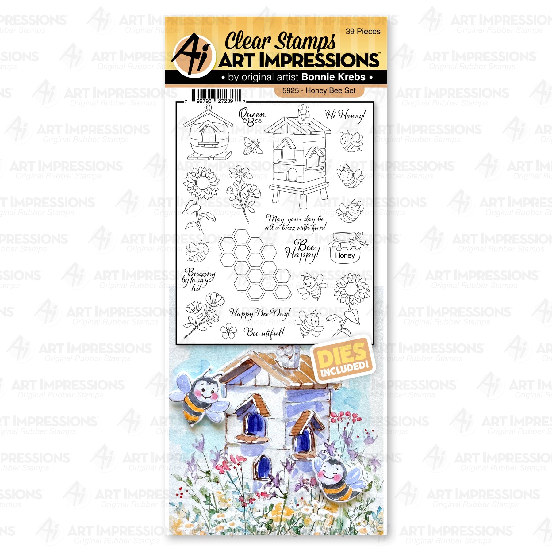 Create sweet and buzz-worthy crafts with the Art Impressions Watercolor Honey Bee Set Clear Stamps and Dies set! This 39-piece set of clear stamps and dies from Art Impressions! Featuring friendly bees, a bee house, and charming sentiments, this set is perfect for coloring with watercolor or any style. Bring a smile to your projects! Overall set dimensions are approximately: 7.5 x 3.5 inches. Sentiments included: