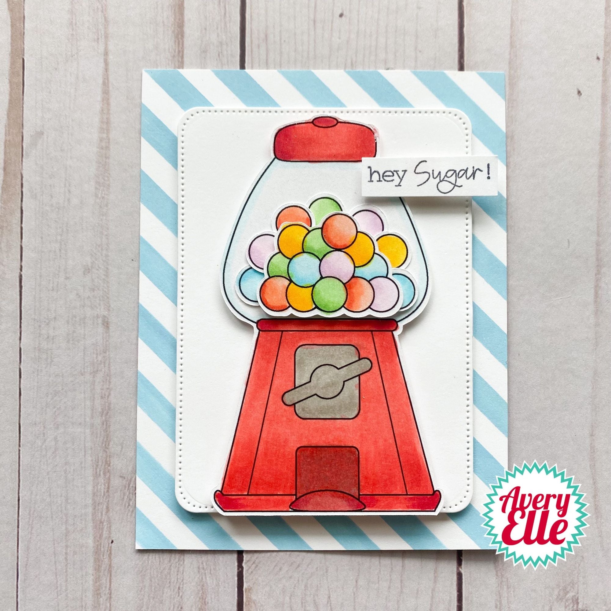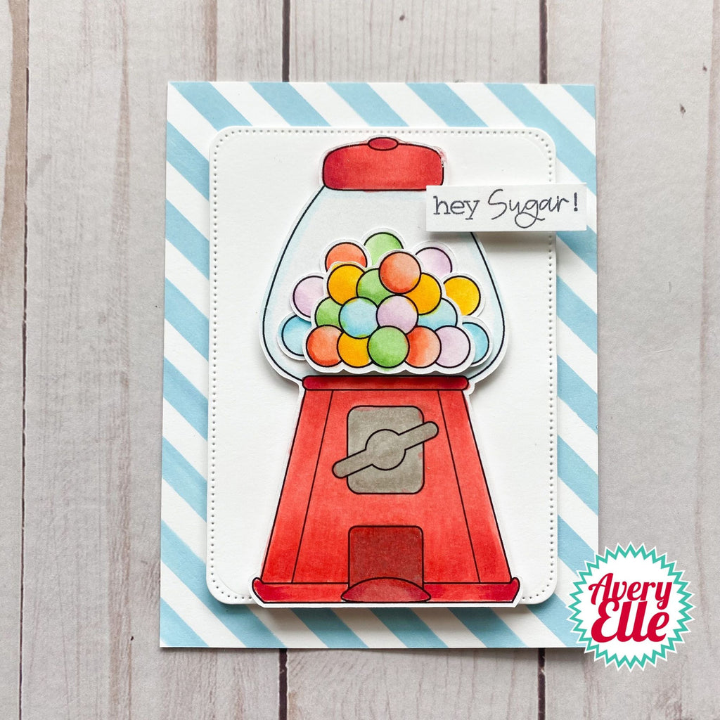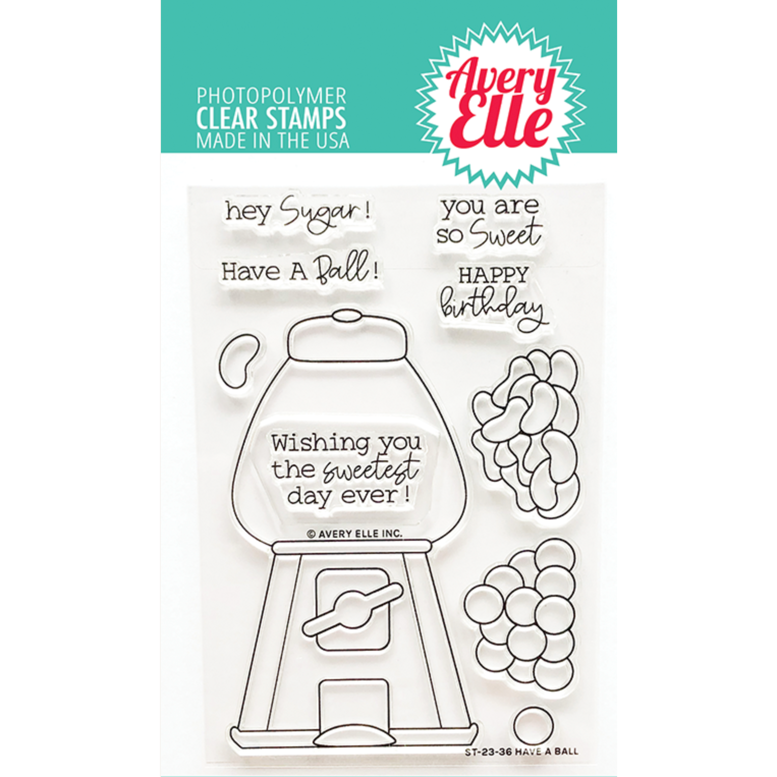Avery Elle presents Have A Ball Clear Stamps - a delightful set featuring an old-fashioned gum ball or candy machine that adds a touch of vintage charm to cardmaking and crafting needs. The set includes adorable gum balls and jellybeans illustrations, accompanied by sweet sentiments, totaling 10 stamps.