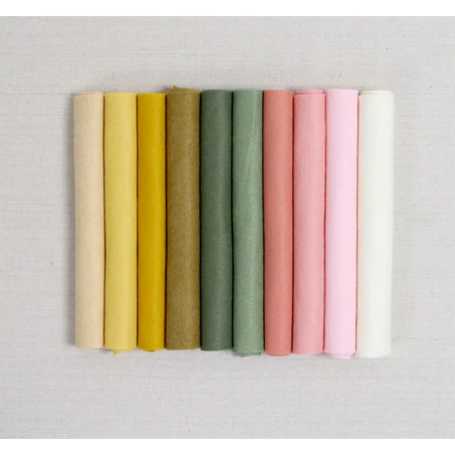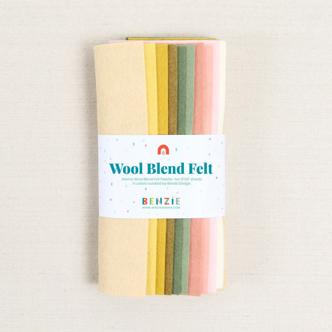 Benzie Design Wool Felt Sheets Boho Garden includes ten 9 x 12-inch sheets in earthy floral tones, with one sheet each in Shortbread, Ochre, Mustard, Bronze, Olive, Sage, Grapefruit, Blush, Peony, and Ecru. These wool-blend felt sheets are made from a blend of approximately 20–35% wool with the remainder rayon and measure about 1 mm thick. The wool comes solely from merino sheep, prized for its quality and softness, making the felt strong, resistant to pilling, and rich in vibrant color, and they can easily be die-cut with standard dies.