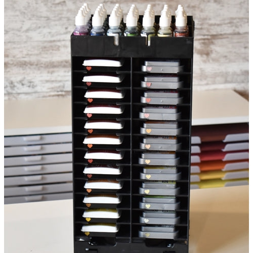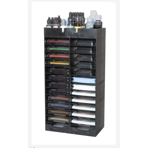 Holds 24 ink pads and up to 28 0.5 fl. oz. Ink Refill Bottles. No assembly required. Approximately 16.5 x 4.5 x 8 inches. Dimensions of the slots are: 1 inch high x 3.875 inches wide x 4.5 inches deep.
