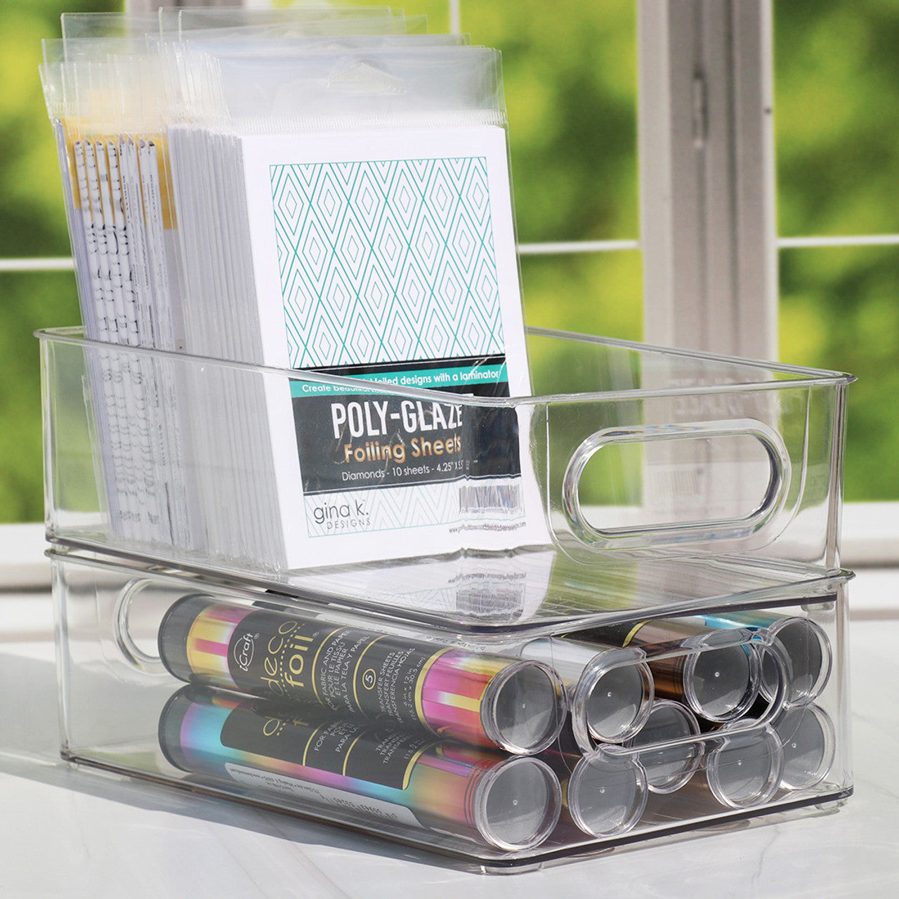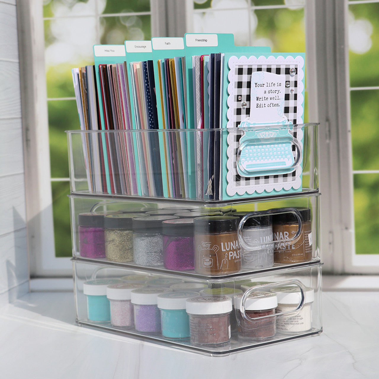 Clear Craft Bins for your Stamps, Dies, Stickers,  Embossing Powder, Cards, & Embellishments! The Best Craft Organizer Small Acrylic Crate is the cutest little craft crate ever! Its small size provides plenty of room to store your craft supplies, cards, embellishments and more. With dimensions of approximately 5.625 inches wide, 9.75 inches deep, and 2.75 inches tall, it's designed to store approximately 75 of your homemade cards, keeping them organized and easy to access. The crate's 5.625-inch width allows you to store your cards in both landscape and portrait orientations, giving you the flexibility to showcase your creations just the way you like. Please note, if you choose to store your cards in landscape orientation, your envelopes will not fit. You must store your cards in portrait orientation if you choose to store your cards with envelopes. What makes the Small Acrylic Crate truly exceptional is its stackable design. Imagine the possibilities! You can stack multiple Crates to make the most of your vertical space, giving you a fantastic storage solution for all your paper crafting supplies. Whether it's foil sheet rolls, toner sheets, embossing powders, or any other essentials, these crates have got you covered.