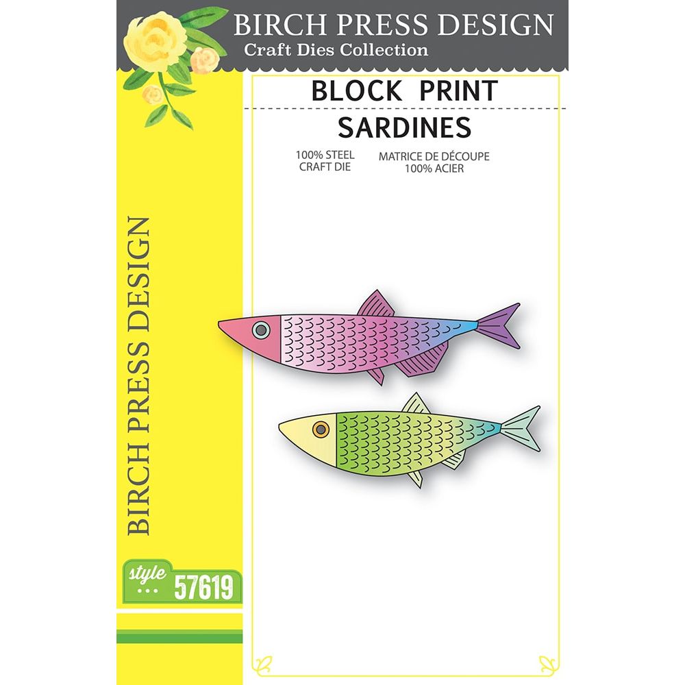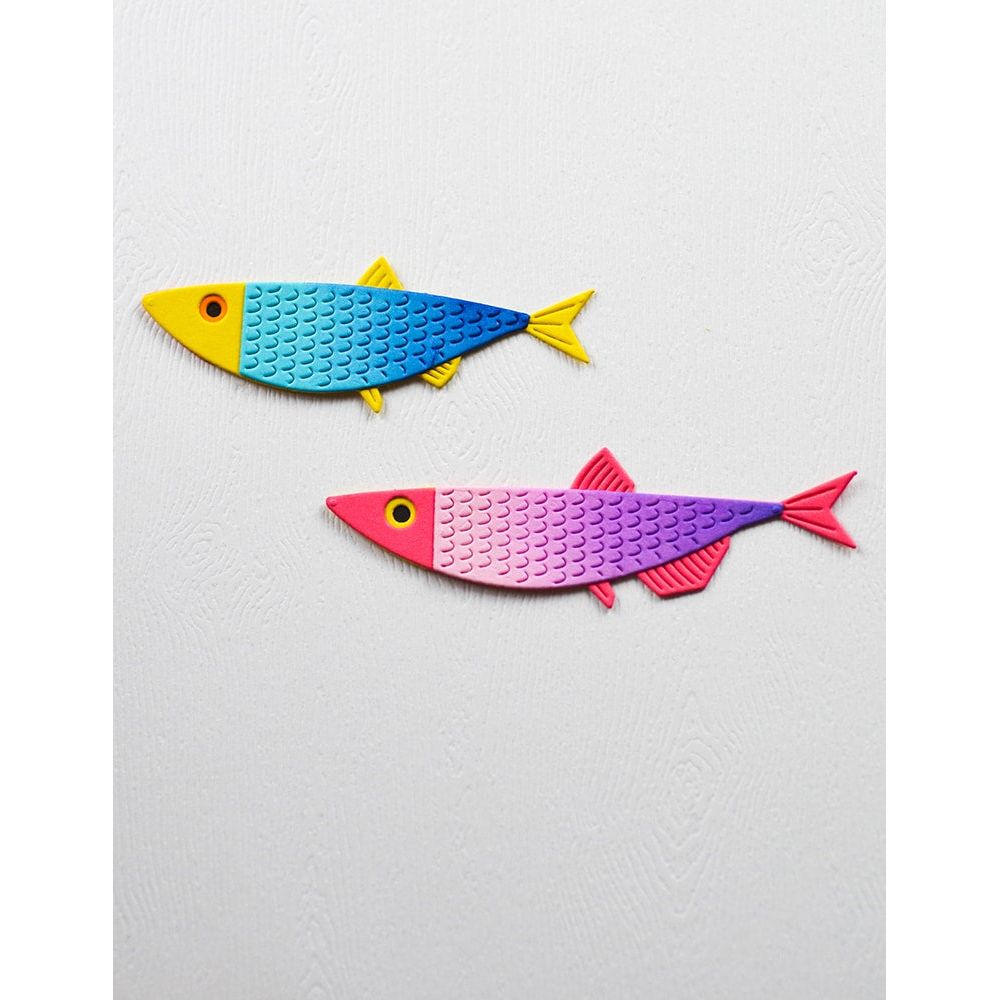 Birch Press Design Block Print Sardines Dies, from the Tide Cool Collection, are crafted from durable steel and designed to work seamlessly with most die-cutting machines. These wafer-thin dies cut effortlessly through cardstock, felt, fabric, and shrink plastic, making them a great addition to your crafting supplies. This set includes 6 dies that cut 8 individual pieces, all detabbed and mounted on a magnetic sheet for convenient storage. Create two stylized fish with layered scales and fins for added texture and dimension. Assembled sizes are approximately 2.7 x 1 inch and 3.2 x 1 inch. Perfect for building lively underwater scenes in cards, journals, and mixed media projects with a bold, graphic style.