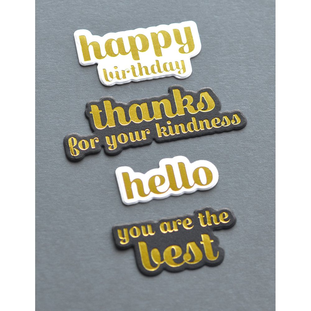 These detailed Hot Foil Plates come with matching dies so that you can foil the image and then have the option of cutting it out. The Hot Foil Plates work with all leading Hot Foil systems to create amazing foiled designs. Use these with transfer foils to add beautiful foiled images to your projects! The set includes 4 Hot Foil Plates and 4 matching craft dies, each offering unique dimensions ranging from 1.3 x 0.4 inches to 2.7 x 0.9 inches. Among the designs are heartfelt sentiments such as "thanks for your kindness," "hello," "happy birthday," and "you are the best," each accompanied by its shadow die for added dimension and versatility. Let your creativity shine with these versatile Hot Foil Plates and matching dies!