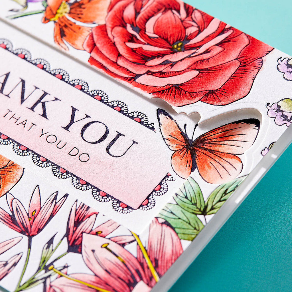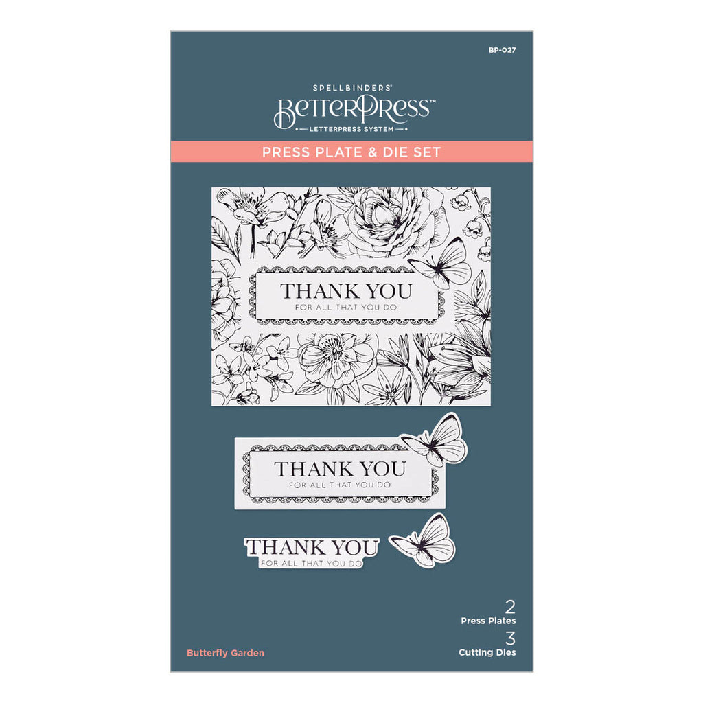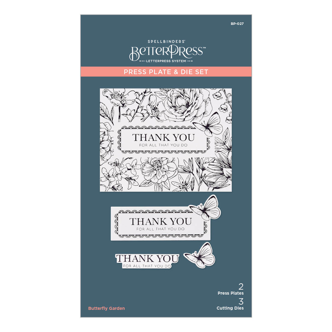 The Butterfly Garden Press Plate & Die Set is a part of the BetterPress Collection by Spellbinders. It features a beautiful A2-sized floral background design along with a framed thank you sentiment plate. The set includes three thin metal cutting dies that cut the sentiment in two ways - the entire plate with butterfly, the sentiment only, and a butterfly shape. To create a crisp letterpress design, simply ink the plate with BetterPress Ink and press it against the BetterPress Cotton Card Panel and Sheets.