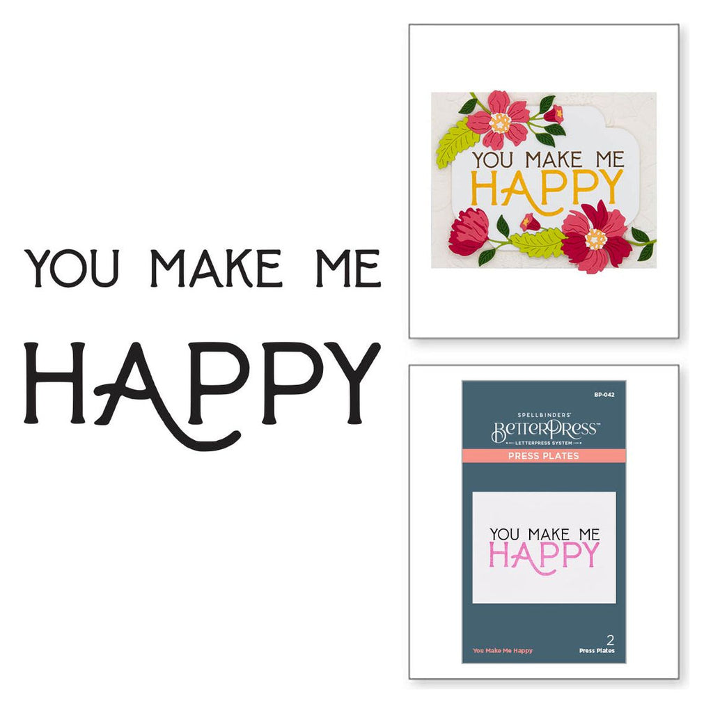 The You Make Me Happy Press Plate is a delightful addition to the BetterPress Collection by Spellbinders. This playful set of two press plates is perfect for spreading happiness and sending someone a cheerful card. To create a crisp letterpress design, simply ink the plate with BetterPress Ink and press it against the BetterPress Cotton Card Panel and Sheets.