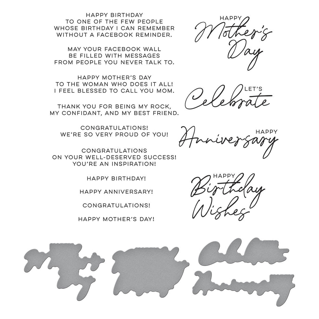 The Let's Celebrate Sentiments Press Plate & Die Set from the Let's Celebrate Collection by Yana Smakula offers 14 different occasion sentiment press plates, ranging from birthdays to anniversaries and even Mother's Day! Accompanied by four thin metal cutting dies that coordinate with the larger sentiments, this set is perfect for your cardmaking creations.