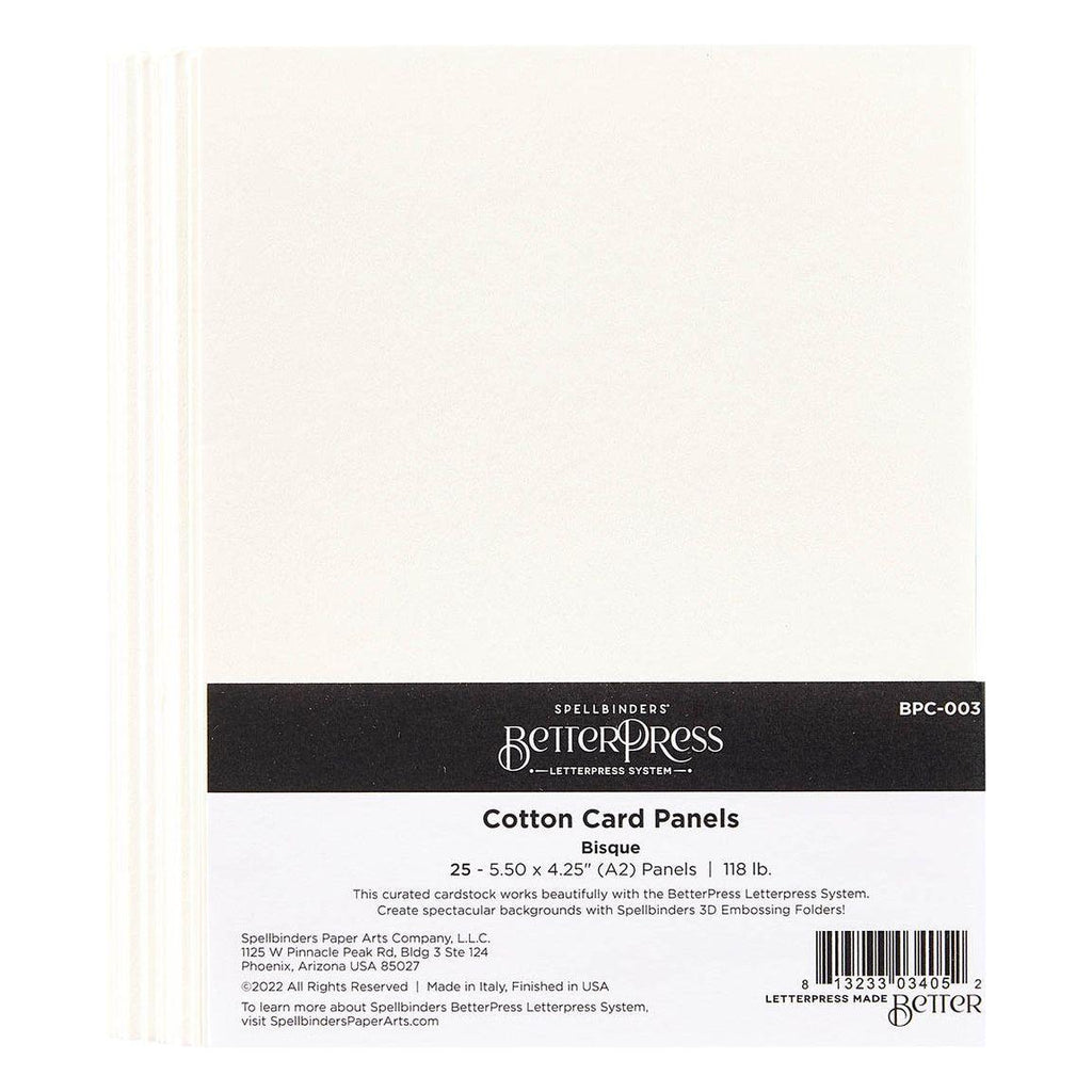 This pack of Bisque BetterPress A2 Cotton Card Panels includes 25 panels in a natural white color, each measuring 4.25 x 5.5 inches. The curated 118lb. cardstock is designed to work perfectly with the BetterPress Letterpress System. Additionally, these panels can be used with Spellbinders’ 3D Embossing Folders to create spectacular sculpted background designs.