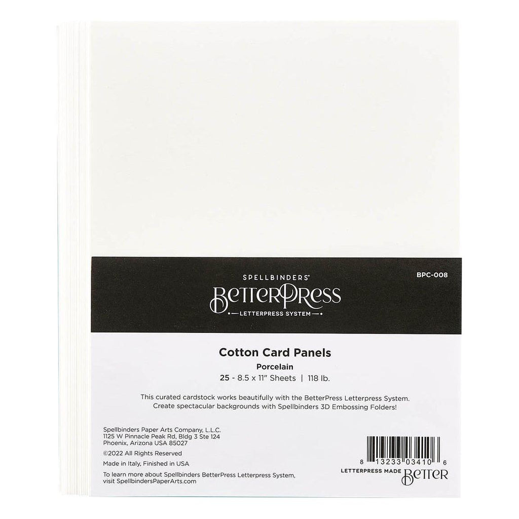 This pack of Porcelain BetterPress Cotton Sheets includes 25 sheets in a brilliant white color, each measuring 8.5 x 11 inches. The curated 118lb. cardstock is designed to work perfectly with the BetterPress Letterpress System. Additionally, these sheets can be used with Spellbinders’ 3D Embossing Folders to create breathtaking sculpted background designs.