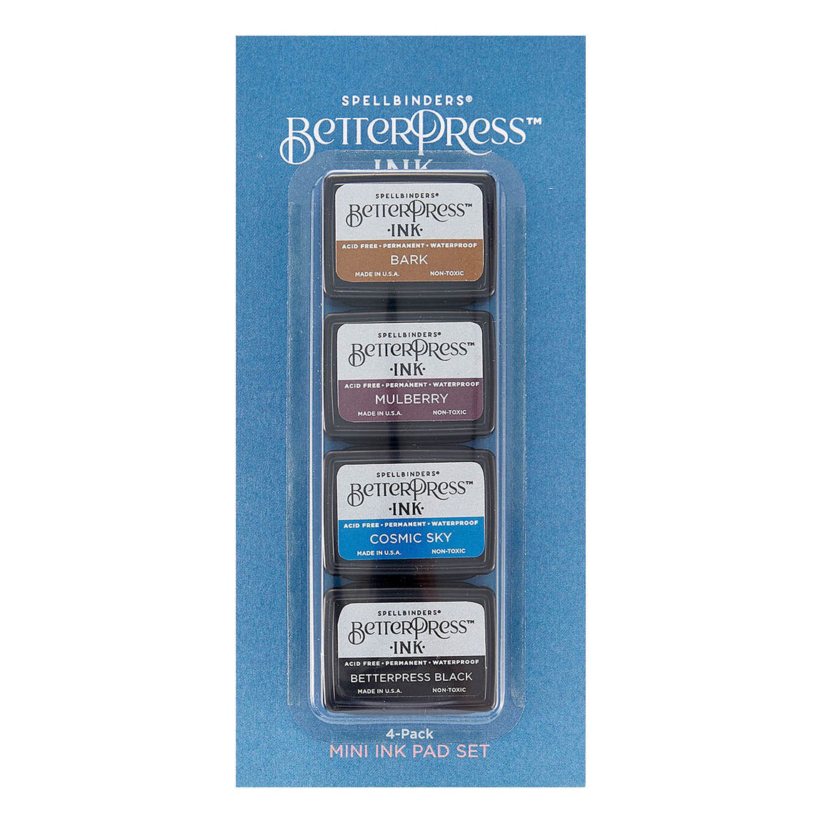 The Regal Tones BetterPress Ink Mini Set comes with four 1.25 x 1.75-inch ink pad colors, including Bark, Mulberry, Cosmic Sky, and BetterPress Black. These inks are specially formulated Ranger Archival Ink that are designed for use with the BetterPress Letterpress System. They are acid-free, permanent, and waterproof. Simply follow the instructions for the BetterPress Letterpress System to create stunning and intricate letterpress effects with these inks. For reinking, use only BetterPress Ink Reinkers (sold separately), and for cleaning the inked press plate, use Ranger Archival Ink Cleaner.