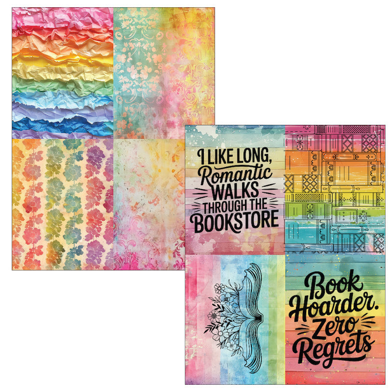 Brutus Monroe Book Hoarder DuoFoil Sheets are part of the Page Turner Collection. These 8.5 x 11-inch sheets feature 8 stunning designs, including 4 with black images that can be hot foiled using a Minc, Fuse, or laminator. Imagery includes crumpled paper textures, floral prints, rows of book spines, and an open book adorned with flowers. Sentiments like "I like long romantic walks through the bookstore" and "Book Hoarder. Zero Regrets" add a playful touch, all presented in vibrant rainbow colors—perfect for book lovers and mixed media artists alike.