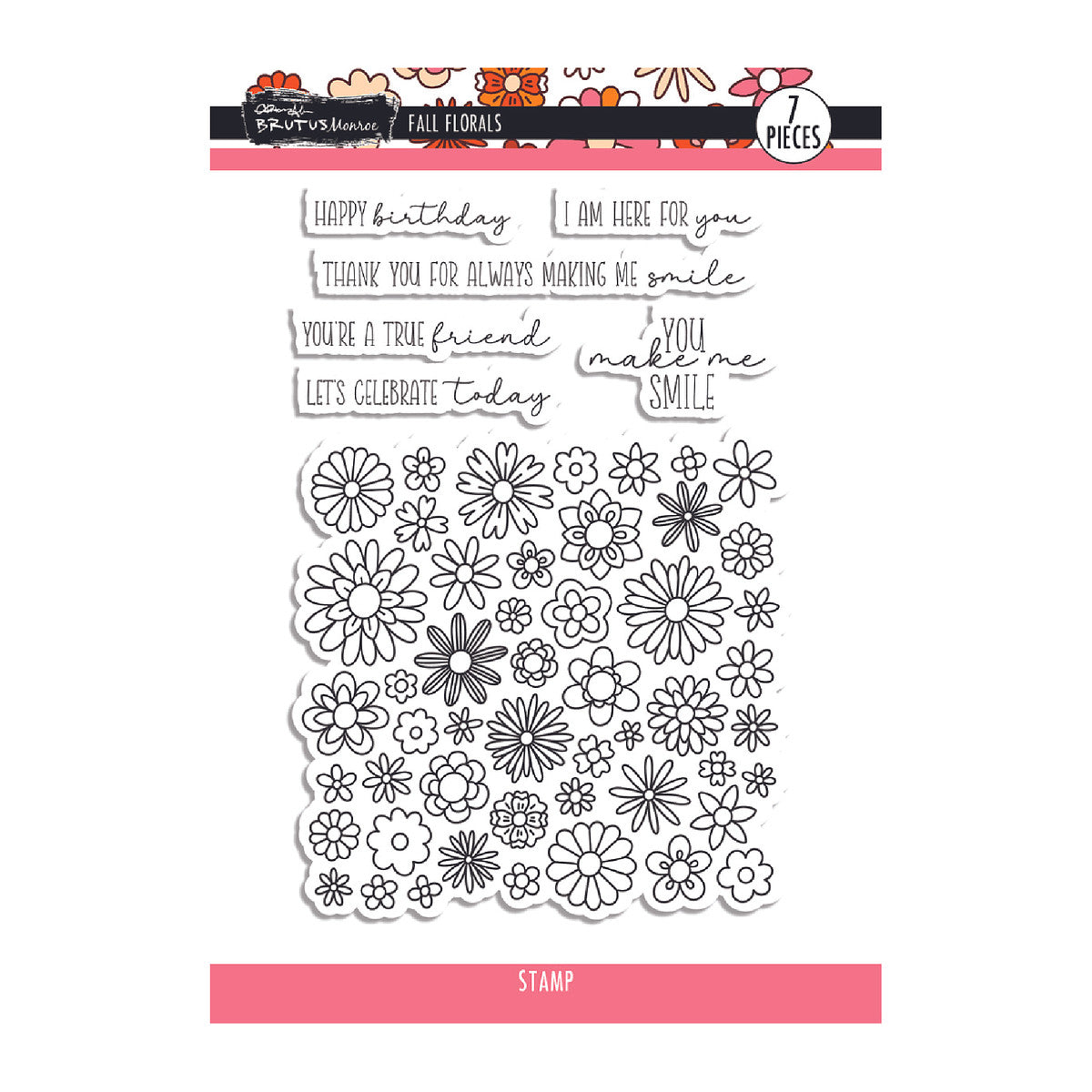 The Brutus Monroe Fall Florals Clear Stamp Set from the Funky Florals Collection beautifully captures the essence of autumn with its intricate flower designs and heartfelt sentiments. This 6 x 8-inch photopolymer stamp set includes 7 pieces, featuring a large square stamp filled with whimsical floral elements and a variety of versatile sentiments. The sentiments included are "Happy Birthday," "I am here for you," "Thank you for always making me smile," "You are a true friend," "Let’s celebrate today," and "You make me Smile." Perfect for adding an autumnal charm to your cards, scrapbooking, and other papercrafting projects.