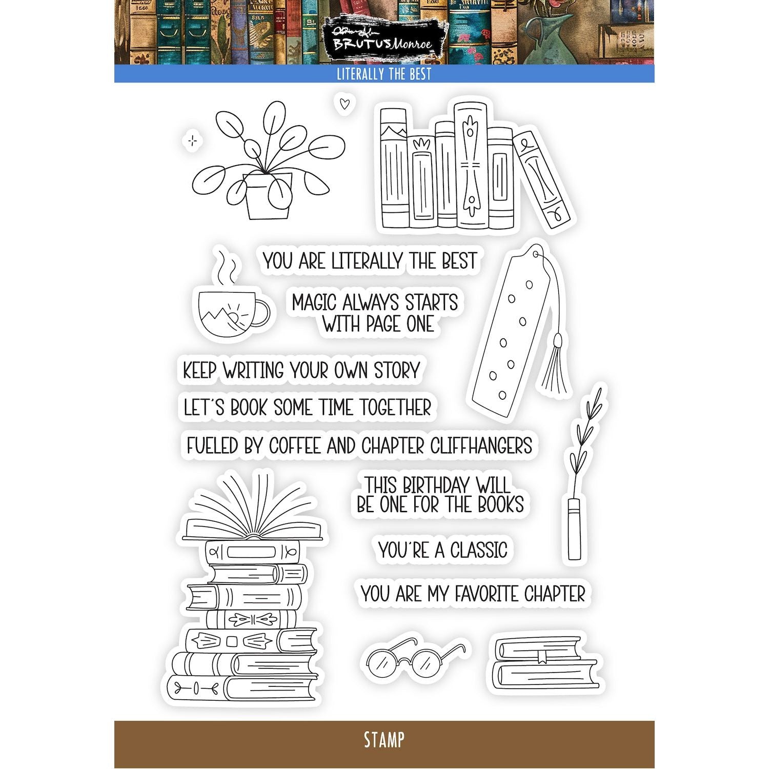 Brutus Monroe Literally The Best Clear Stamp Set is part of the Page Turner Collection. This 6 x 8-inch clear photopolymer stamp set includes 18 pieces. The designs feature stacks and rows of books, a bookmark, glasses, plants, a hot drink, and the following sentiments: "You are literally the best," "Magic always starts with page one," "Keep writing your own story," "Let’s book some time together," "Fueled by coffee and chapter cliffhangers," "This birthday will be one for the books," "You’re a classic," and "You are my favorite chapter."