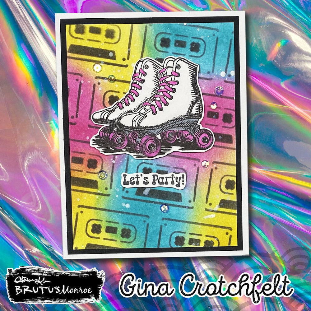 The Brutus Monroe Roll With It Stamp Set is a 3x4 inch photopolymer stamp set that features a classic pair of roller skates and 4 sentiments. This stamp set is perfect for creating cards, tags, and other projects that celebrate the joy of roller skating.
