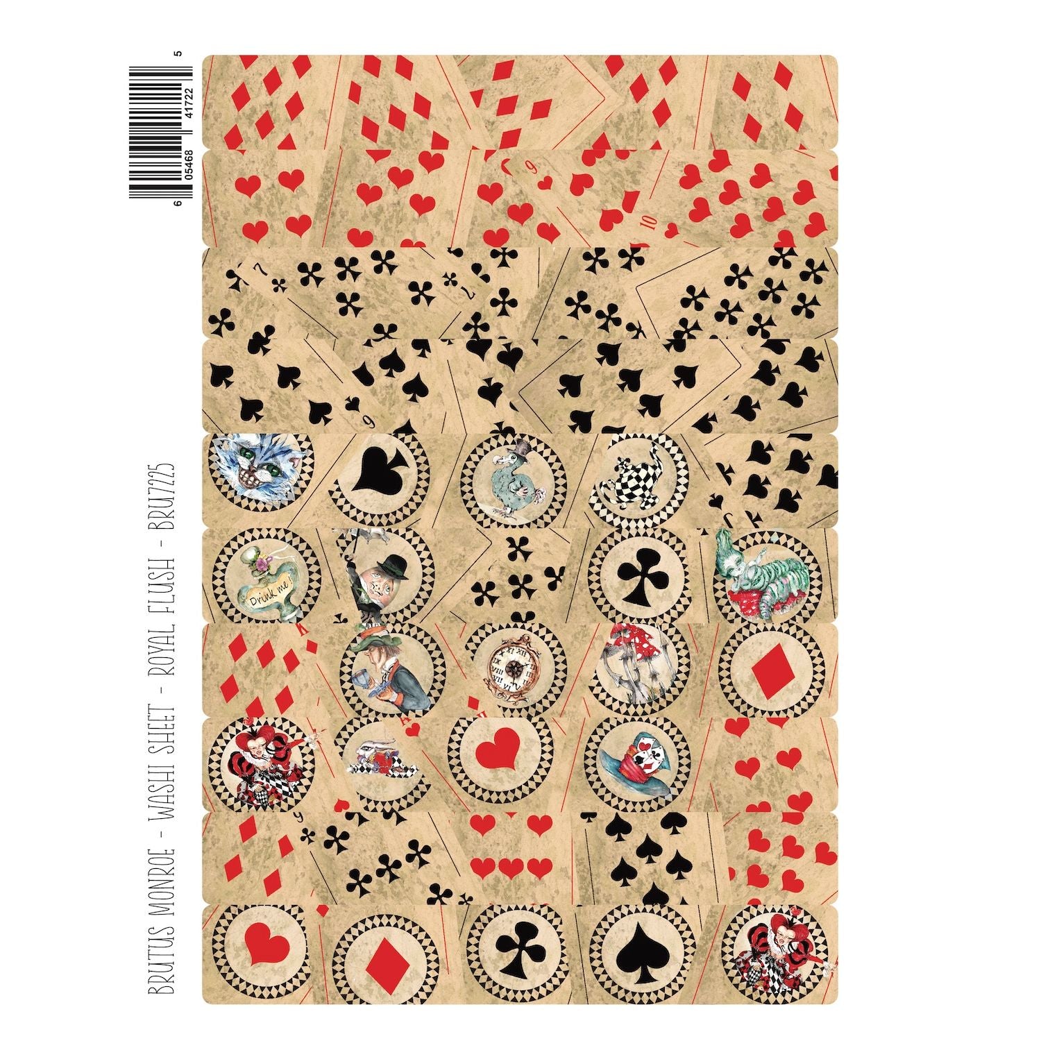 Brutus Monroe Royal Flush Washi Sheets are part of the Wonderland Collection. These peel-and-stick adhesive sheets combine inspiration from a deck of cards with a whimsical Alice in Wonderland twist. Designs include card suits of diamonds, hearts, spades, and clubs, along with beloved characters such as the Cheshire Cat, the Dodo Bird, the Caterpillar, the Mad Hatter, the White Rabbit, Humpty Dumpty, and the Queen of Hearts. Additional motifs feature a “Drink Me” bottle, a teapot, a hat, mushrooms, and a clock. Each pack includes two 8.5 x 11-inch sheets with ten strips each, perfect for embellishing journals, scrapbooks, planners, or DIY projects with playful, nostalgic charm.