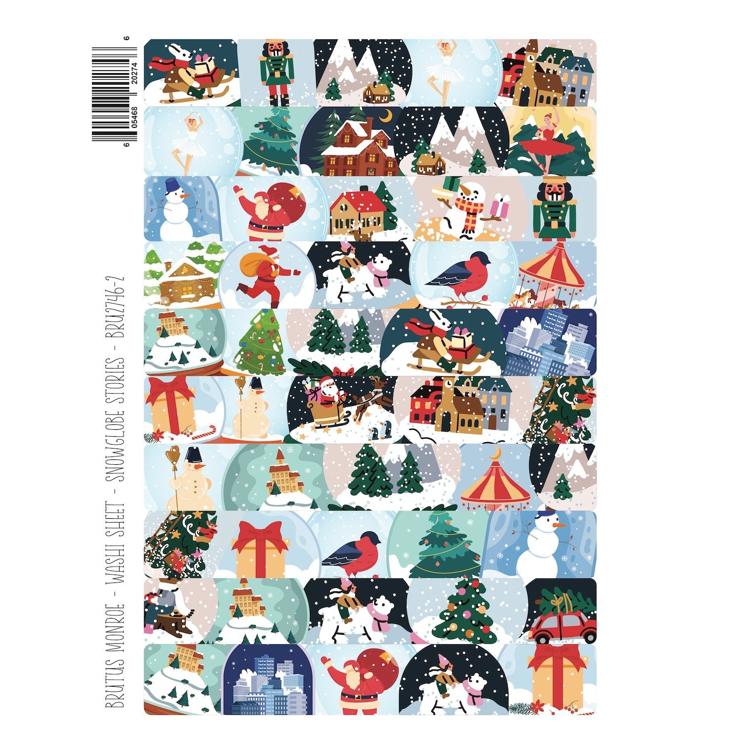 Brutus Monroe Snowglobe Stories Washi Sheet, from the City Sidewalks Collection, features peel-and-stick adhesive strips filled with classic cartoon-style holiday icons. Designs include nutcrackers, snowmen, houses, ballerinas, birds, wrapped presents, decorated trees, Santa Claus, snowfall, sledding, polar bears, and more. Each pack includes two 8.5 x 11-inch sheets with ten strips per sheet, ready to trim and add a festive touch to cards, scrapbook layouts, journals, and mixed-media projects.