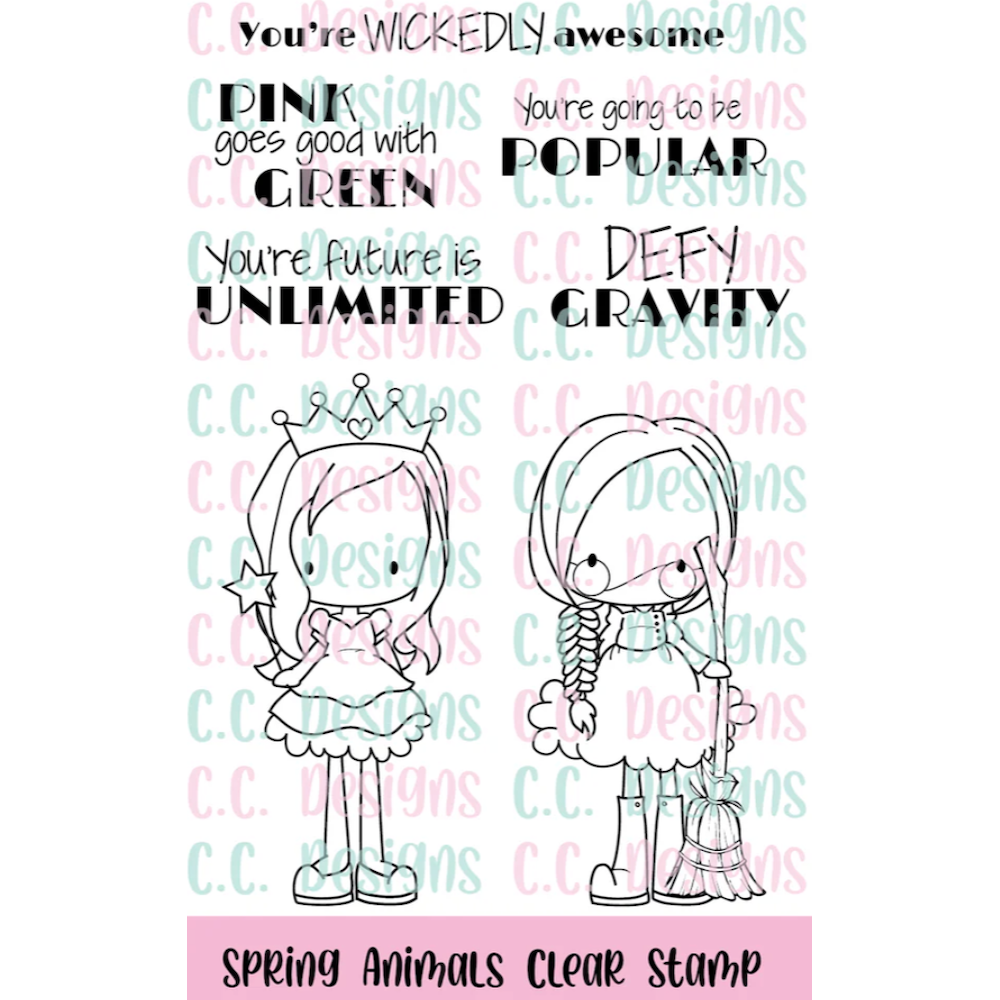 C.C. Designs Pink Green Clear Stamp Set is a playful character stamp set inspired by a pink-and-green color story with a subtle wink to a wickedly popular theme. Featuring two adorable characters and bold, confidence-boosting sentiments, this set is perfect for cards, scrapbook pages, and handmade projects that celebrate friendship, individuality, and big dreams. The fun mix of imagery and sayings creates designs that feel magical, modern, and just a little bit wicked. Made from high-quality clear photopolymer for crisp impressions and easy coloring. Stamp set size is approximately 4 x 6 inches.