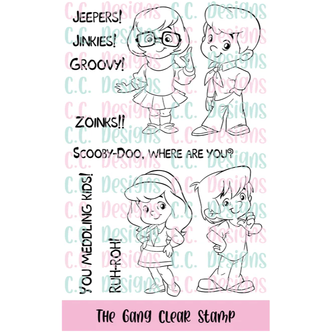 The C.C. Designs The Gang Clear Stamp Set is a 4 x 6 inch stamp set that features a delightful collection of characters and 7 fun sentiments inspired by a beloved mystery-solving group. Sentiments include,
