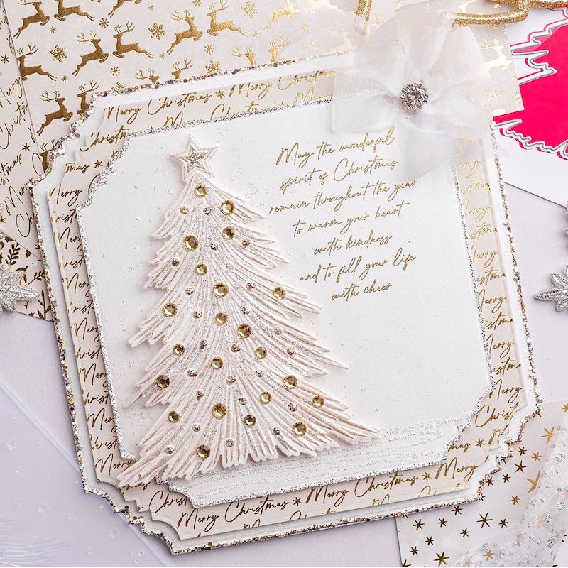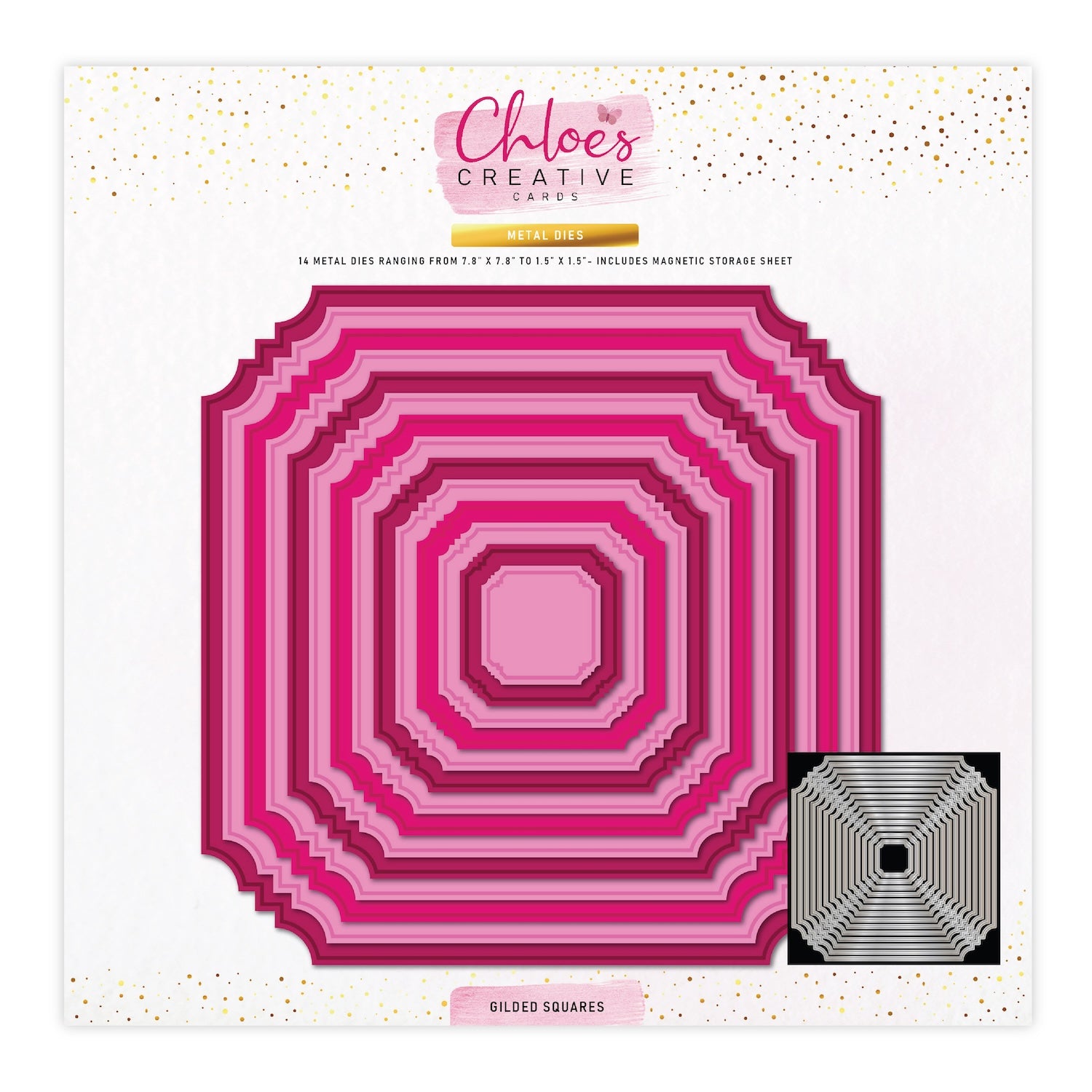 Chloe's Creative Cards Gilded Squares Dies are part of the Gilded Christmas Collection. This 8 x 8-inch set includes 14 metal dies, ranging in size from approximately 7.8 x 7.8 inches to 1.5 x 1.5 inches (19.8 x 19.8 cm to 3.8 x 3.8 cm), and comes with a magnetic storage sheet for easy organization. Each die features chic bevelled corners, perfect for adding stylish dimension to your card bases, mats, frames, and layered designs.