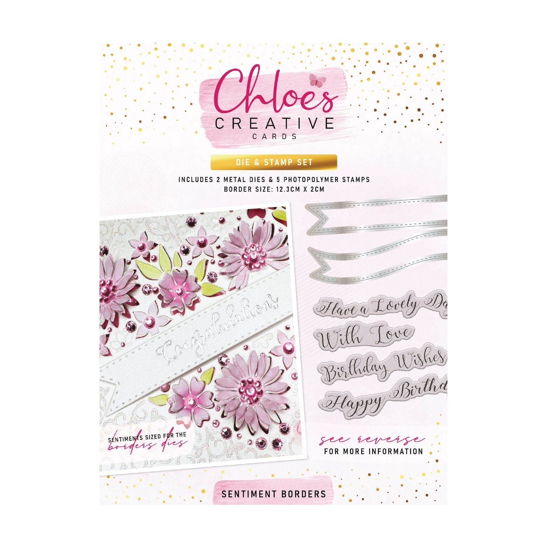 Chloe's Creative Cards Sentiment Borders Die and Stamp Set, part of the Daisy Collection, is ideal for adding heartfelt touches to your handmade cards. This set includes 5 clear photopolymer stamps with ffiveour delicate script sentiments: "Have a lovely day," "With Love," "Birthday Wishes," "Congratulations," and "Happy Birthday." It also features two fishtail banner dies—one straight and one wavy. The largest die measures approximately 4.8 x 0.8 inches (12.3 x 2 cm). These banner dies are perfectly sized to fit within the Dancing Daisy Cut and Emboss Folder (c-cemb-danced) or the Heartfelt Daisy Cut and Emboss Folder (c-cemb-heartd).