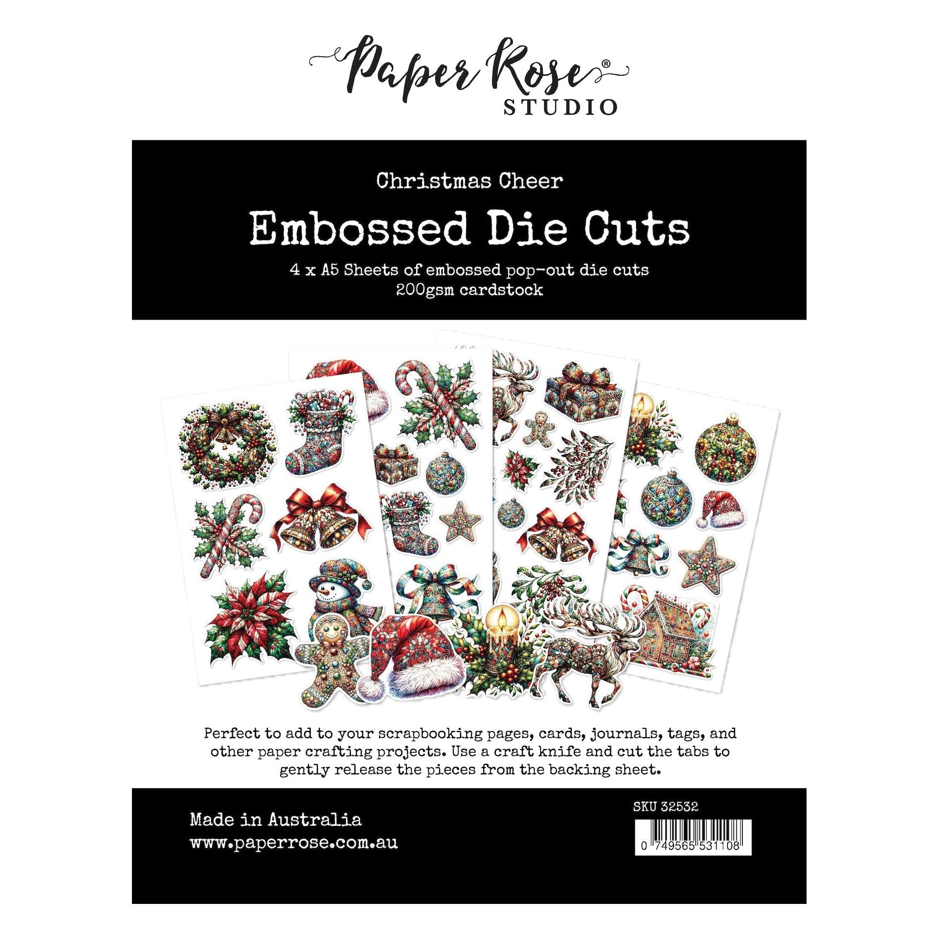 Christmas Cheer Embossed Die Cuts offer a delightful selection of ephemera for your crafting projects. Each set includes four A5 sheets of pop-out die cuts, meticulously crafted from durable 200gsm paper for easy release from the backing sheet. Featuring printed images with selectively embossed areas, these die cuts add depth and dimension to your creations. To use, simply employ a craft knife to carefully cut the tabs, allowing the die cuts to be gently removed without any damage. Designs include mosaic stockings, ornaments, gingerbread men, reindeer, Santa hats, gingerbread houses, bells, candy canes, stars, poinsettias, wreaths, and more.