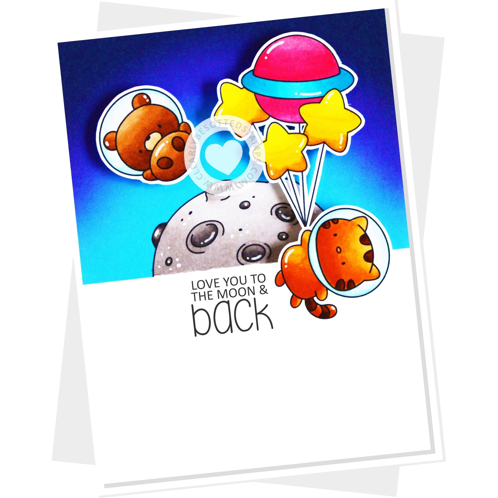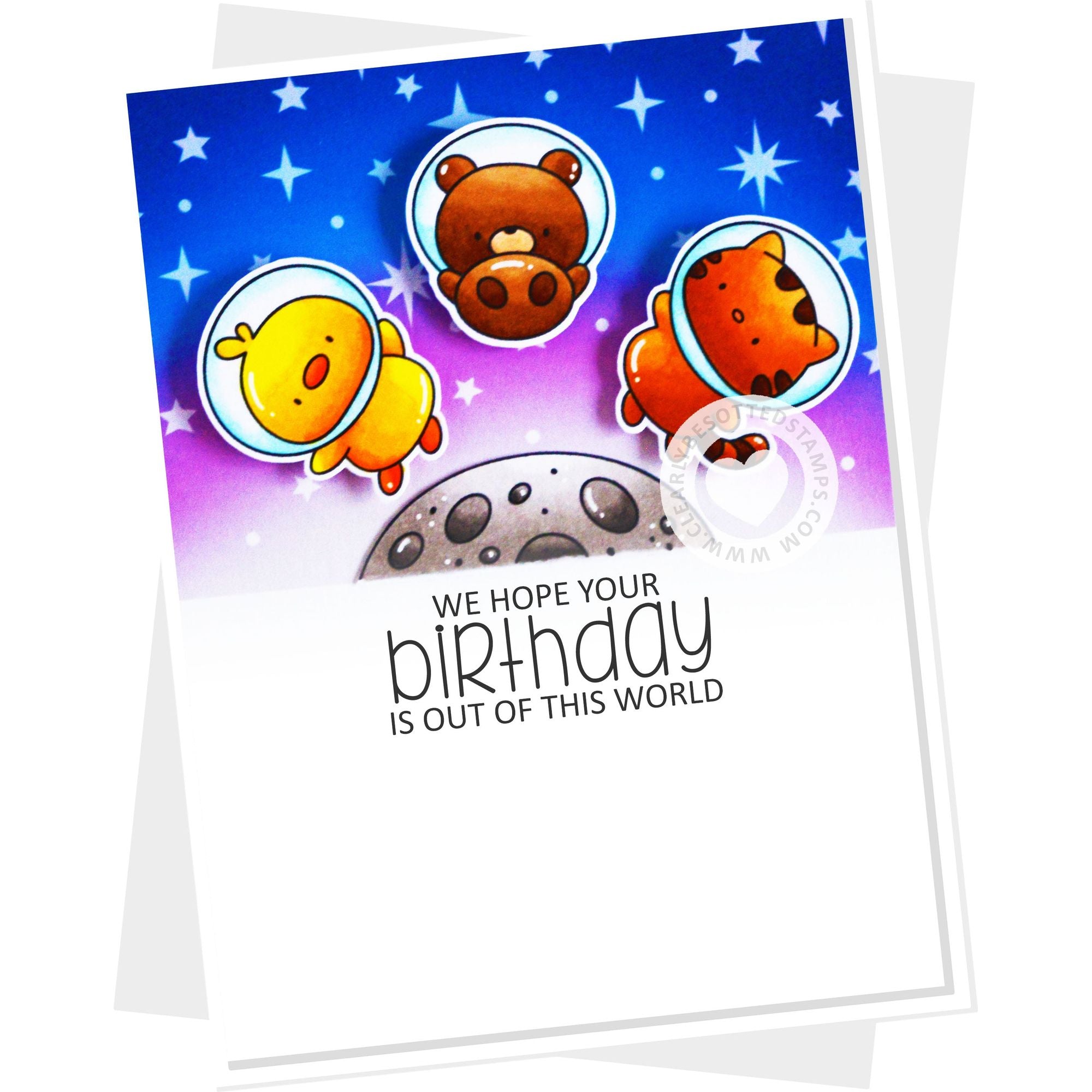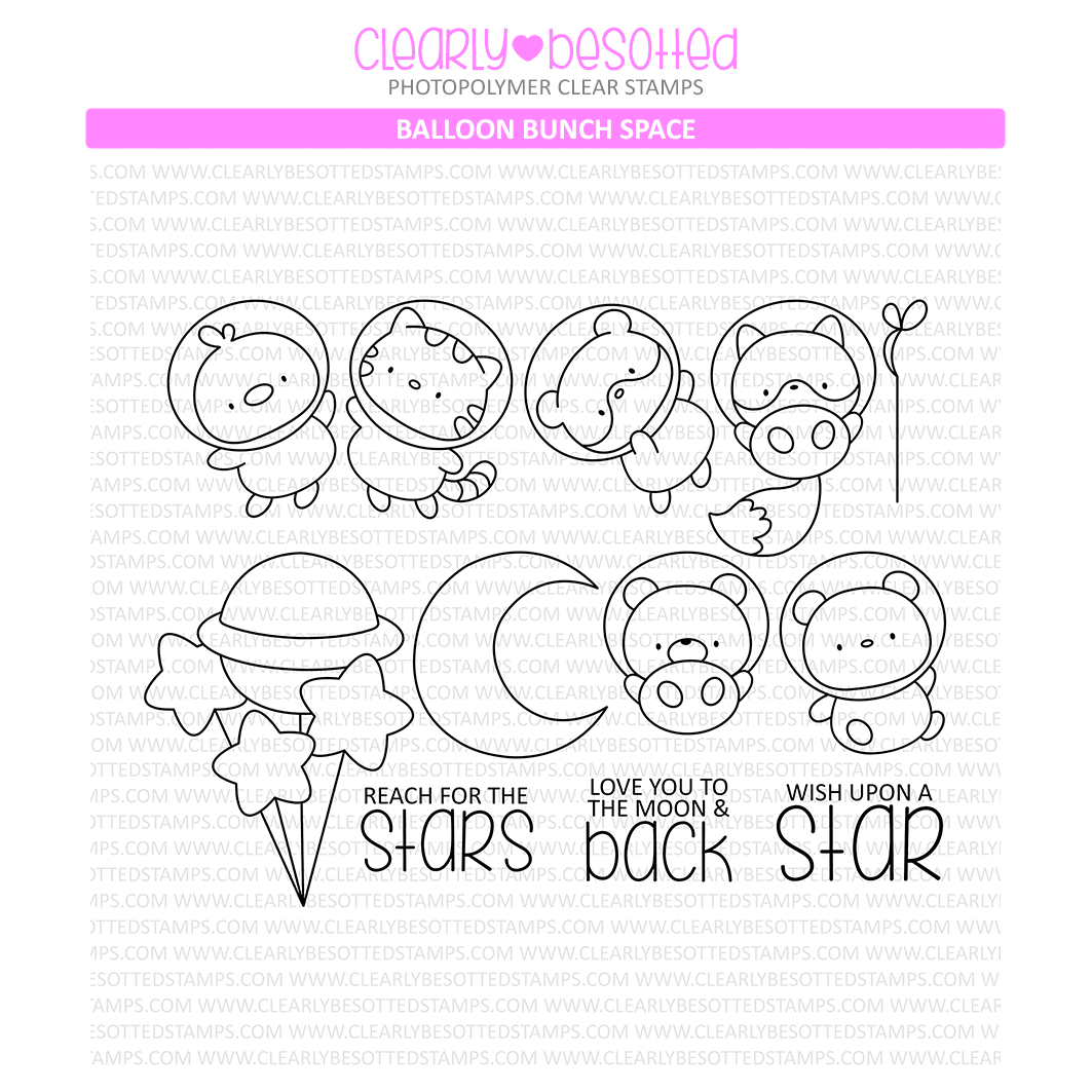 Clearly Besotted Balloon Bunch Space Clear Stamps is a 4x6 inch clear stamp set that will transport you to an out-of-this-world adventure! This collection features 6 adorable critters in astronaut gear, flipping and floating in zero gravity. You'll also find a variety of images including balloons shaped like stars and a planet, a whimsical moon for a nighttime scene, string, sentiments, and additional accessory stamps to complete your cosmic creation.