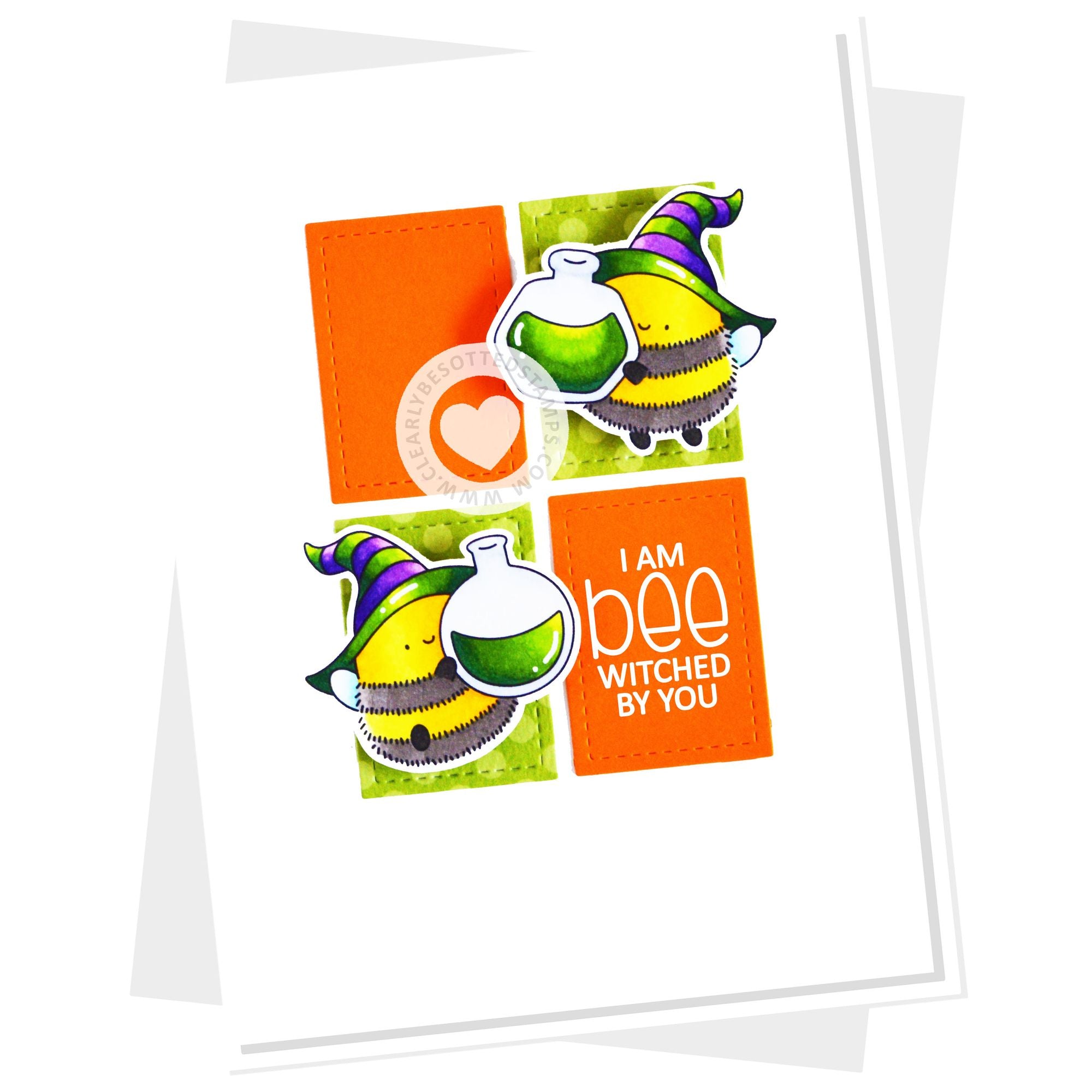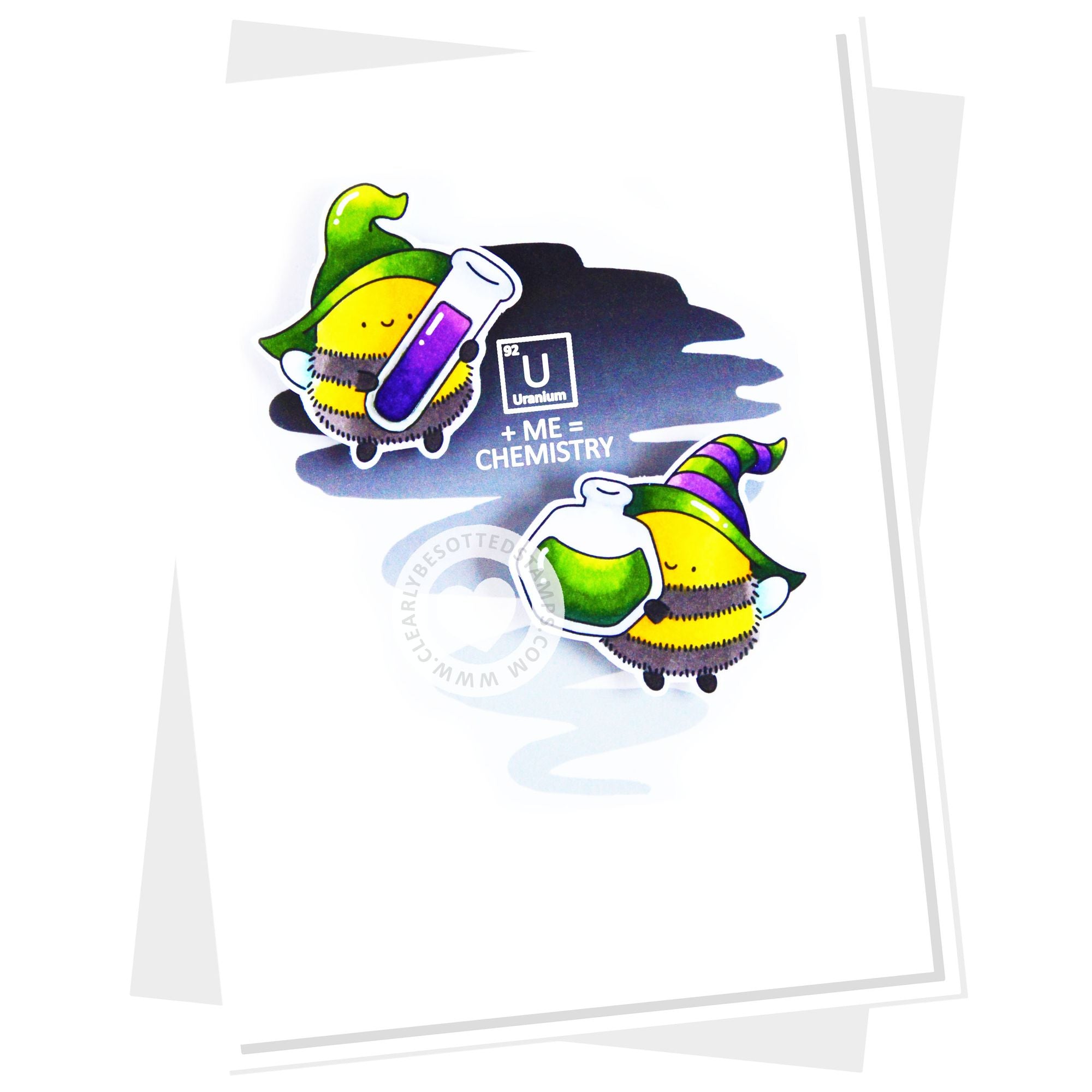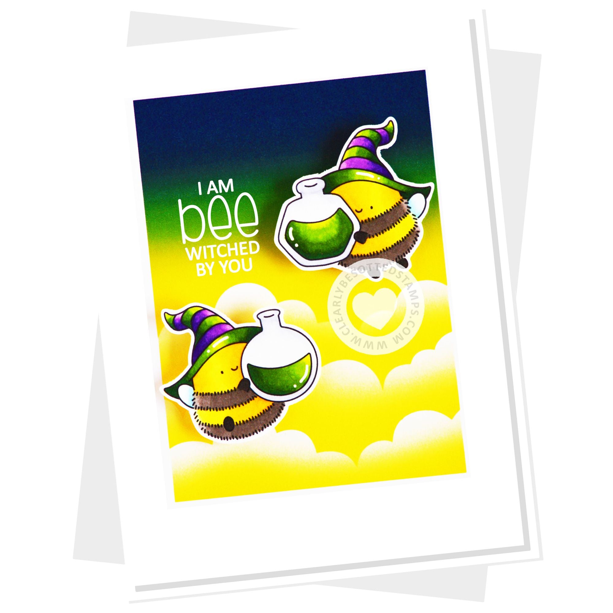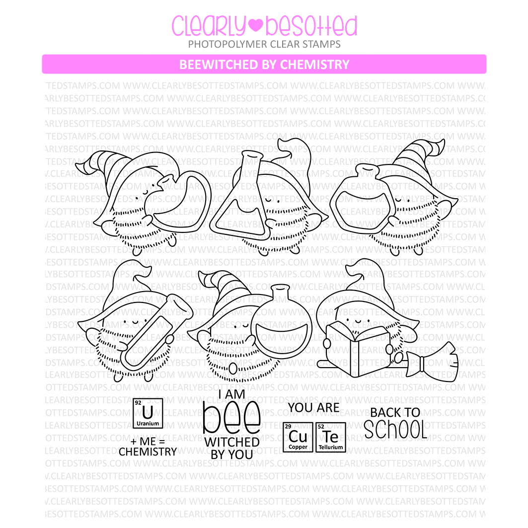 Clearly Besotted Beewitched By Chemistry Clear Stamps is a 4x6 inch clear stamp set brimming with magical little wizard bees busy at work brewing potions. This enchanting collection features 5 adorable bees wearing pointed hats and holding beakers, potions, and books to conjure up some fun. Also included is a whimsical chemistry scene complete with a flying broomstick, 2 elemental sentiments, and 9 complementary sentiments to add a touch of alchemical magic to your projects.