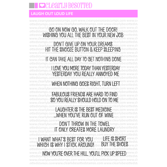 The Clearly Besotted Laugh Out Loud Life Clear Stamp is a versatile and expressive addition to your stamp collection. This clear stamp set features 11 fun and lighthearted sentiments that can be used to convey humor, joy, and laughter in your crafting projects. These sentiments are perfect for creating cards, scrapbook pages, and other creative endeavors that bring smiles and amusement to those who see them.
