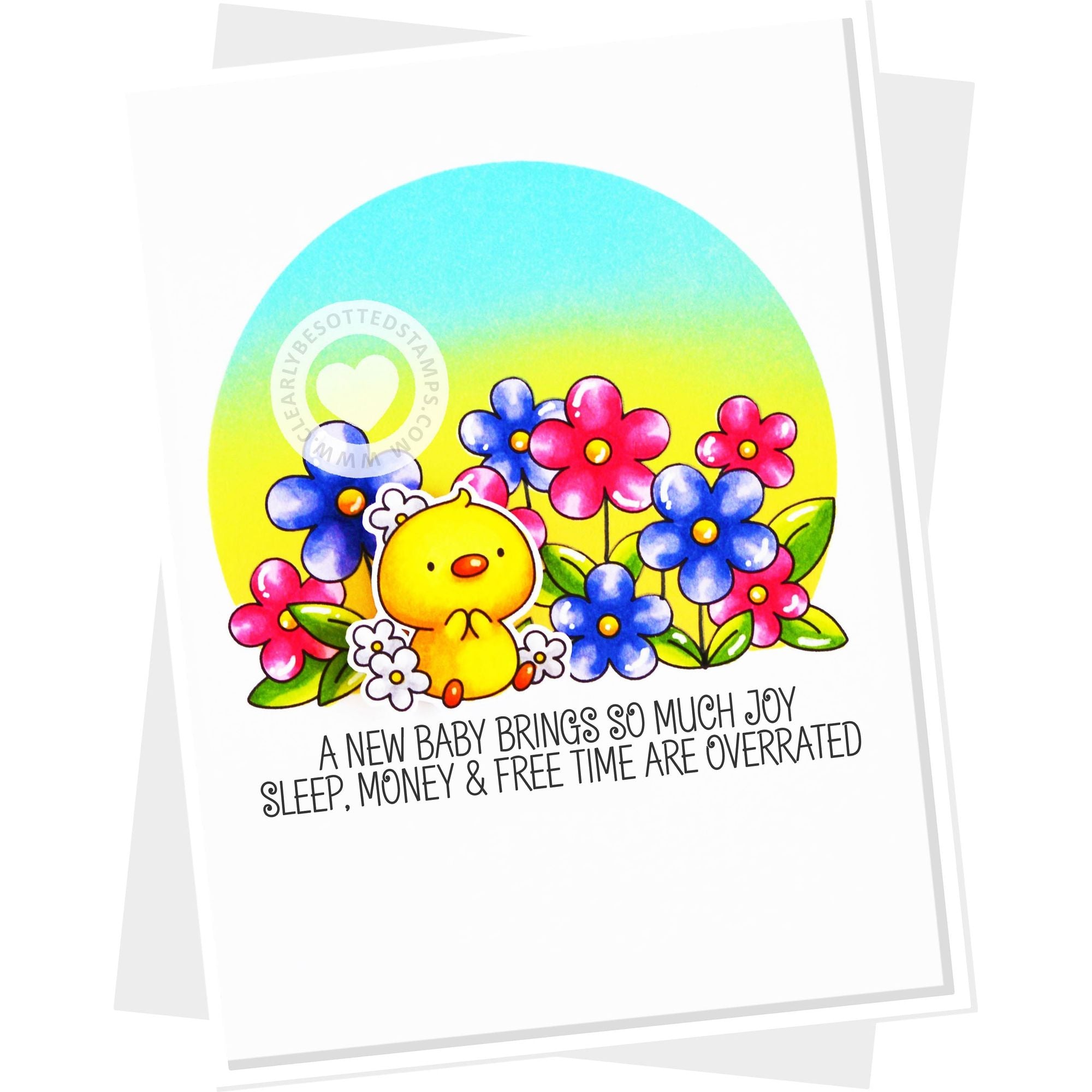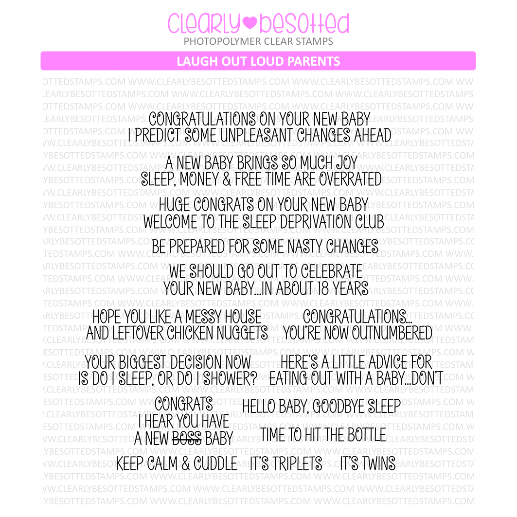 This 4x6 inch clear stamp contains 16 silly sentiments for the parents in your life! Friends with new babies, could use a laugh and this set will give them just that!