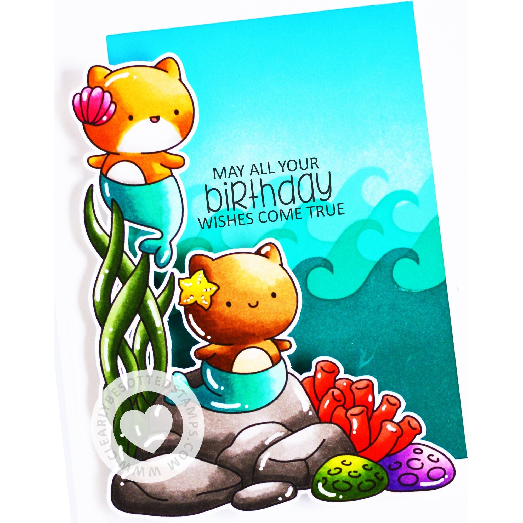 This enchanting 4x6 inch clear stamp set features a delightful collection of images that will add a touch of magic to your projects. The set includes a plushie animal fairy, a plushie unicorn in a scenic rainbow and cloud corner, and two plushie cats dressed as mermaids in an under the sea themed corner.
