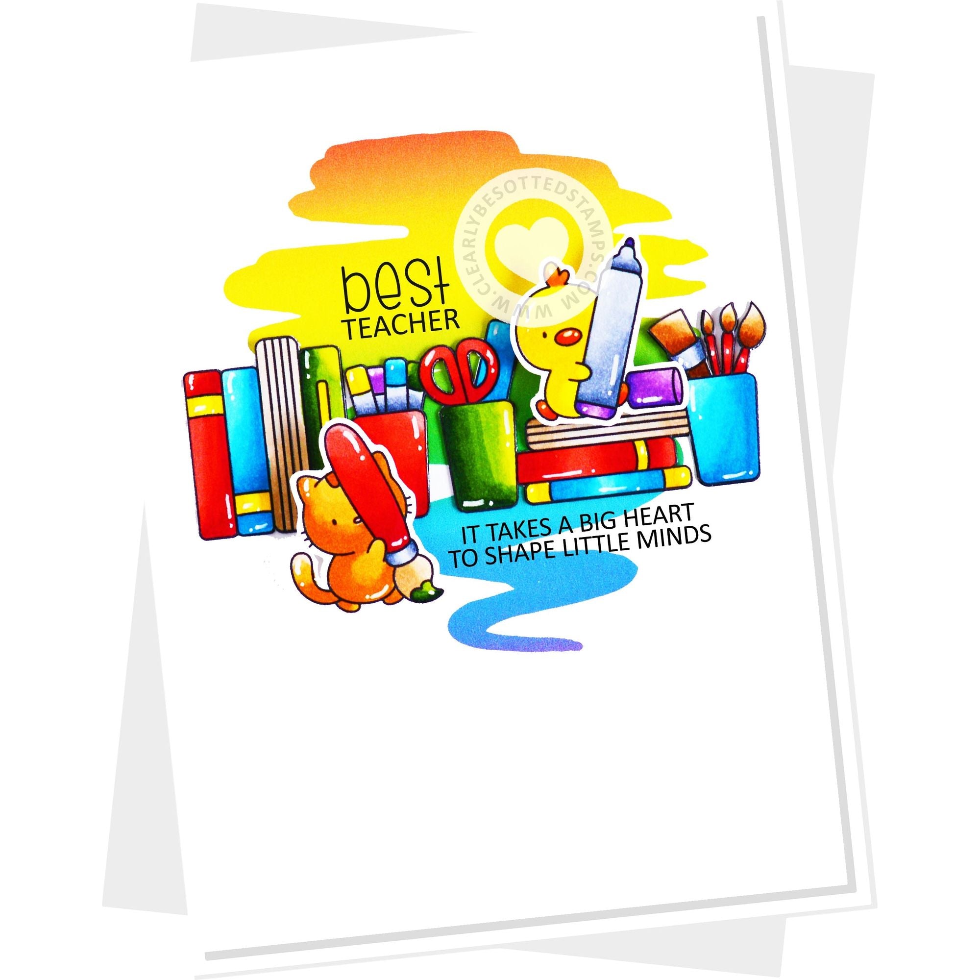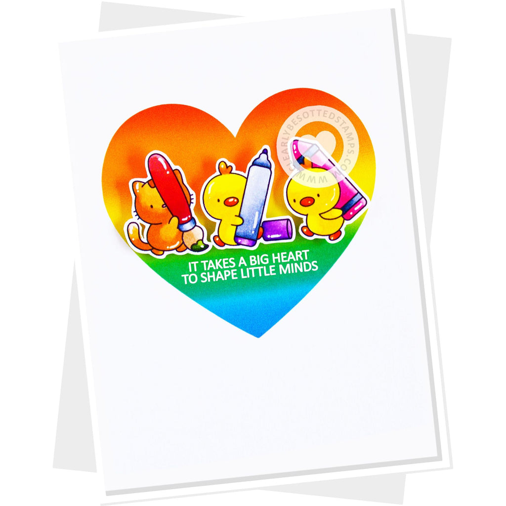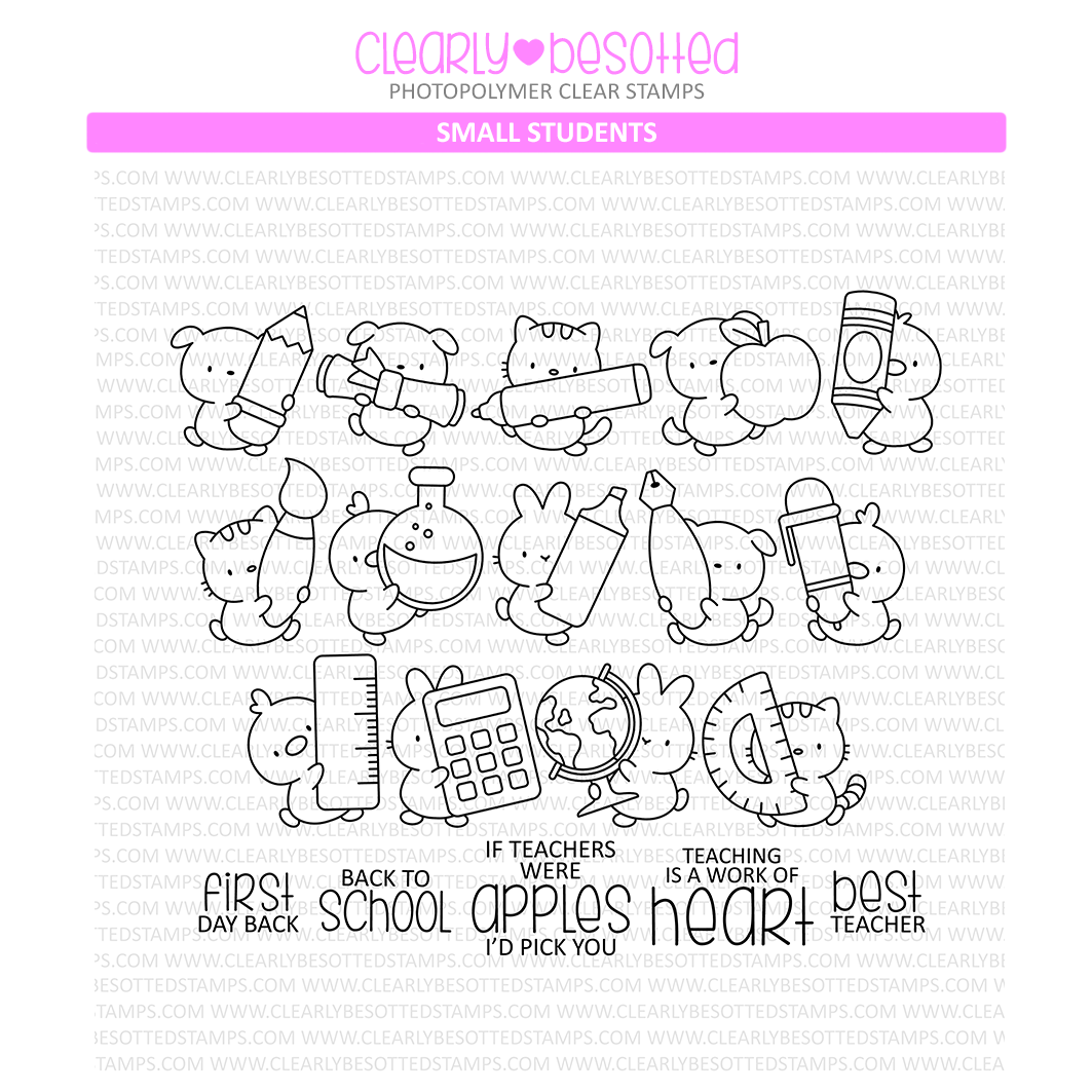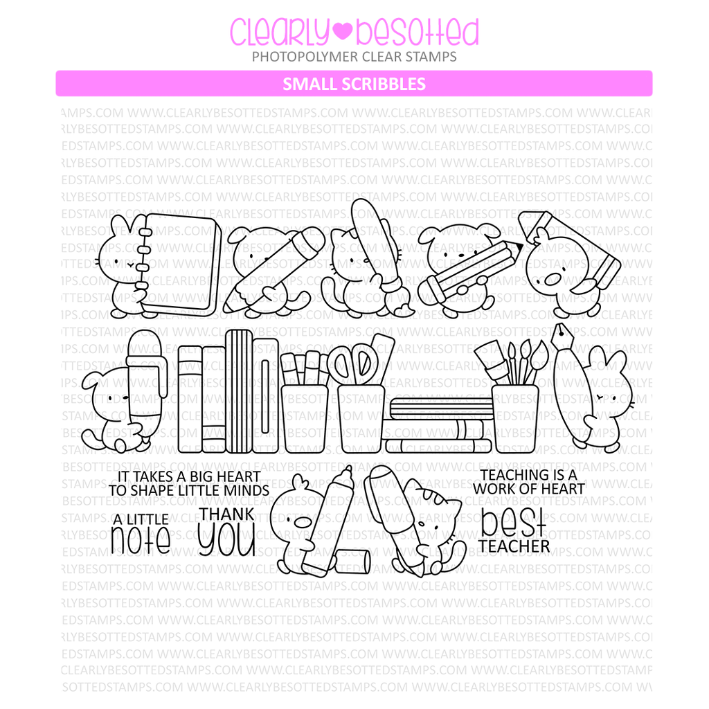 This 4x6 inch clear stamp contains 14 adorable critters are ready to write! They are holding different writing, coloring, and painting instruments. 7 sentiments included too!