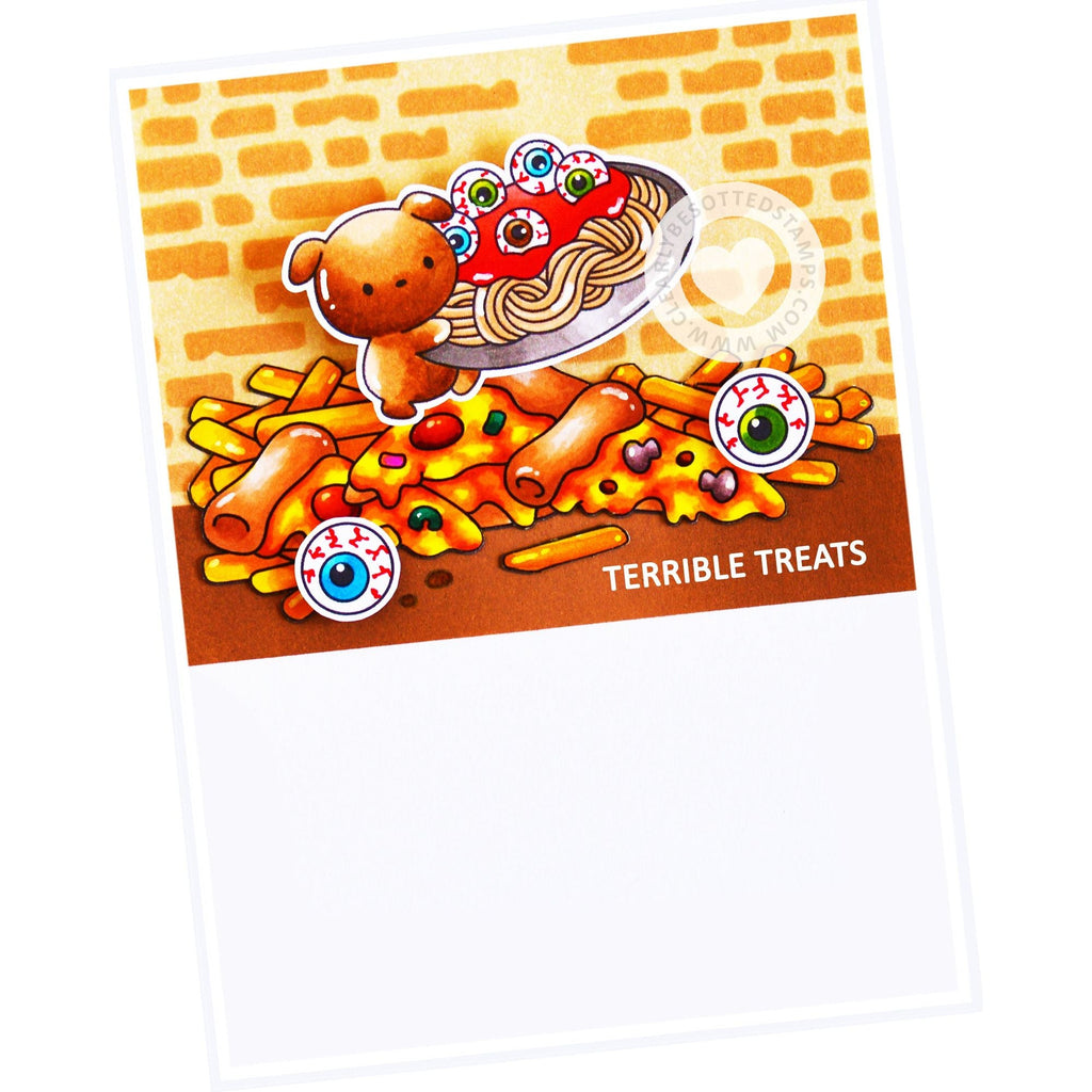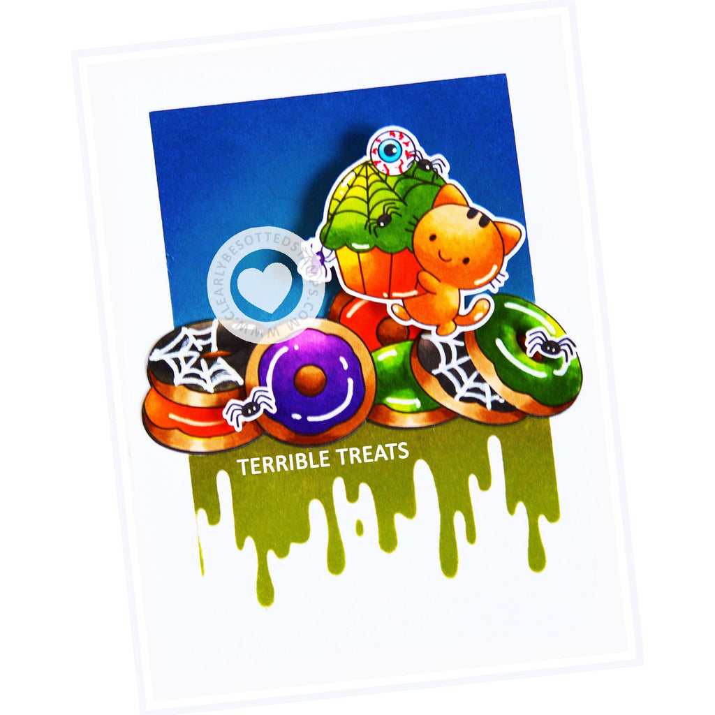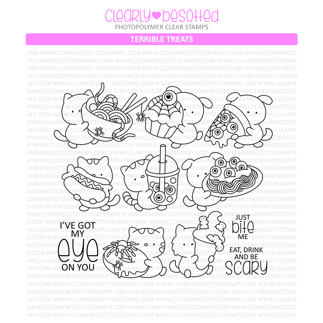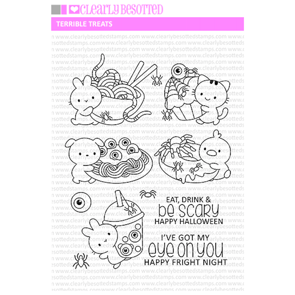 The Clearly Besotted Terrible Treats Clear Stamps, a delightful 4x6 inch set, provides everything you require for your charmingly creepy Halloween projects. This set features images of cute little animals enjoying spooky snacks, a bowl of worms, cupcakes adorned with spiderwebs, donuts sporting eyeballs, and eyeball boba tea! Additionally, it includes some adorably scary sentiments to complete your Halloween-themed creations.
