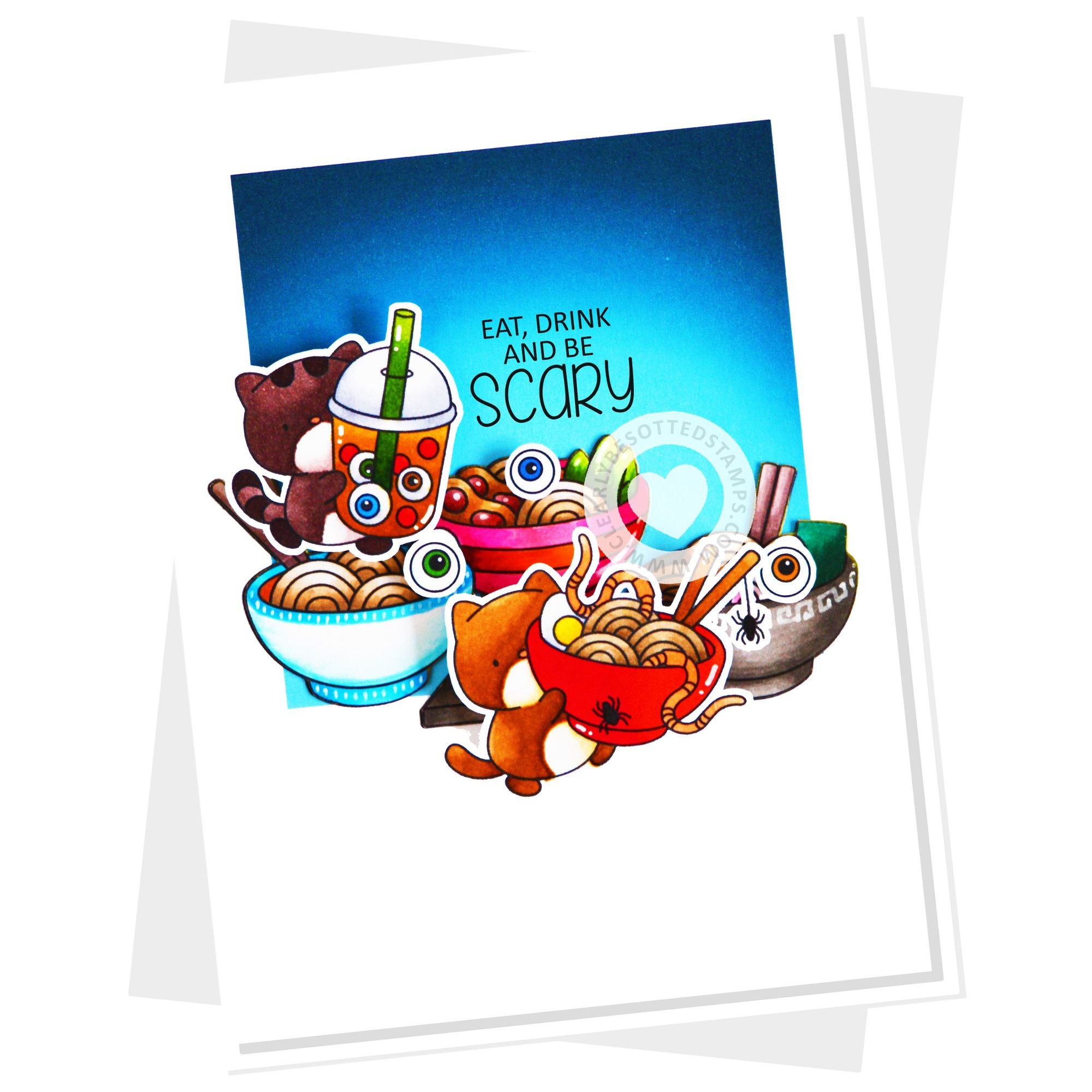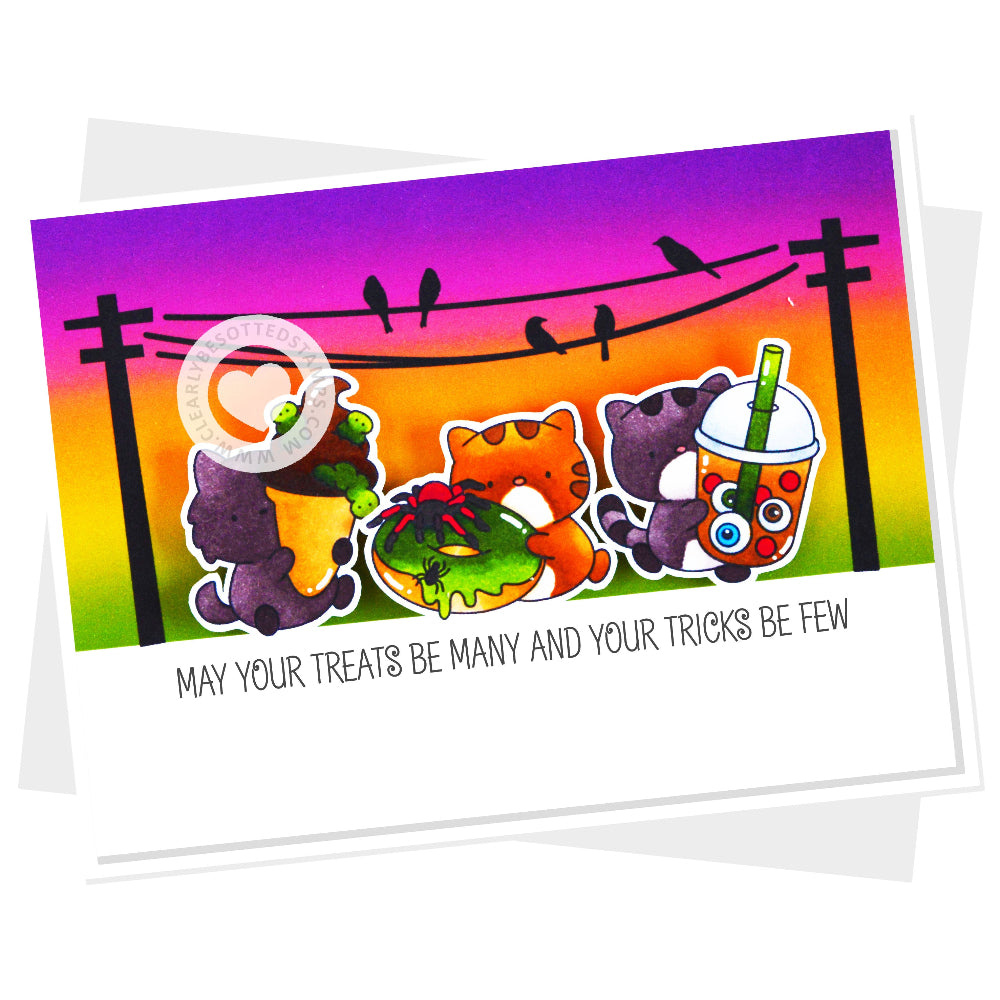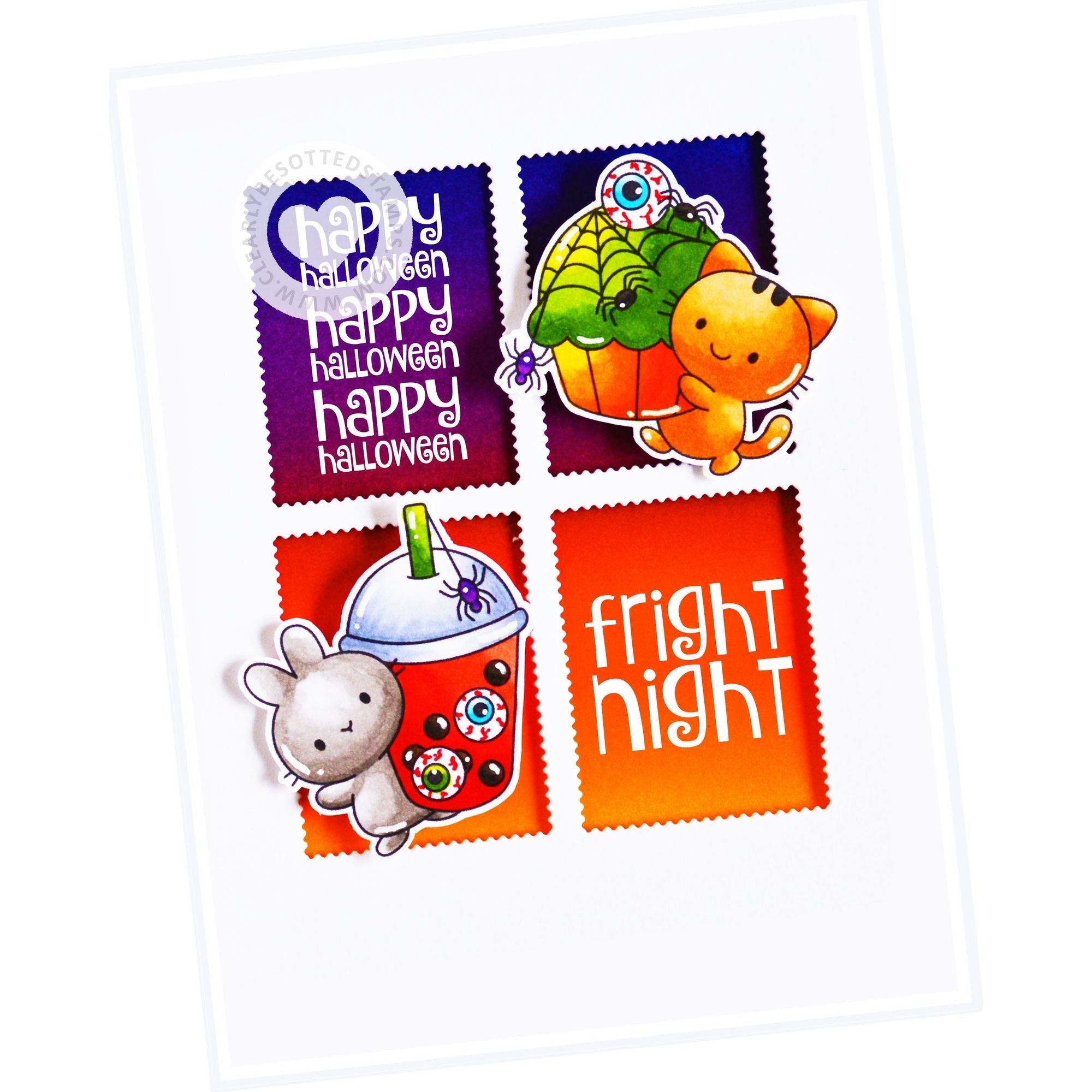 The Clearly Besotted Terrible Treats Clear Stamps, a delightful 4x6 inch set, provides everything you require for your charmingly creepy Halloween projects. This set features images of cute little animals enjoying spooky snacks, a bowl of worms, cupcakes adorned with spiderwebs, donuts sporting eyeballs, and eyeball boba tea! Additionally, it includes some adorably scary sentiments to complete your Halloween-themed creations.