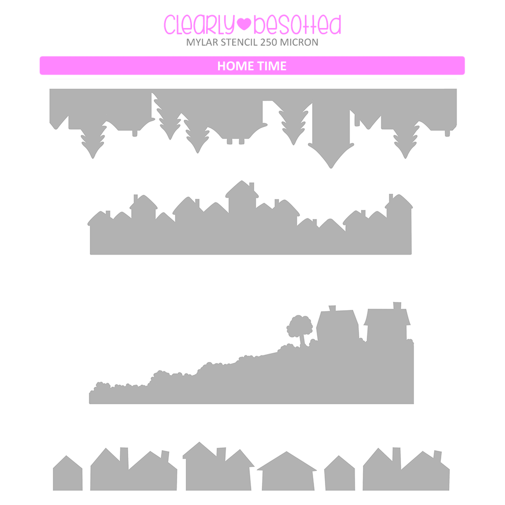 The Clearly Besotted Home Time Stencil is a high-quality crafting stencil that includes a single mylar stencil with a charming design. The stencil features several rows of detailed quaint houses, and hills arranged in a straight line. The houses can be adorned with intricate windows, and the skyline horizon adds to the picturesque scene. This stencil is perfect for creating lovely scenes on a variety of surfaces, such as paper, fabric, or wood. The stencil's mylar material makes it durable and easy to clean for repeated use. With the Clearly Besotted Home Time Stencil, you can effortlessly add a touch of cozy charm to your DIY projects!