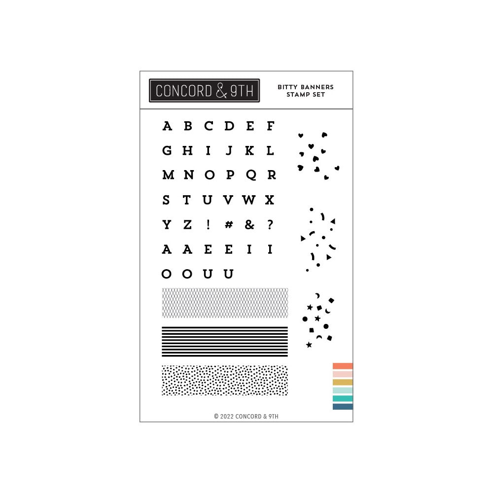 Create adorable little banners to use on all kinds of cards and other projects with the Bitty Banners Stamp Set! The letters stamp in a strip and can be cut out with the coordinating Bitty Banners Dies 11754 to quickly and easily build a library of letters. Add some flair to your banners with the long patterned stamps by stamping the letters over the pattern before cutting them out. The stamp set also contains clusters of hearts, confetti, and various shapes that accentuate your designs. This 4 x 6-inch clear stamp set contains 13 pieces.