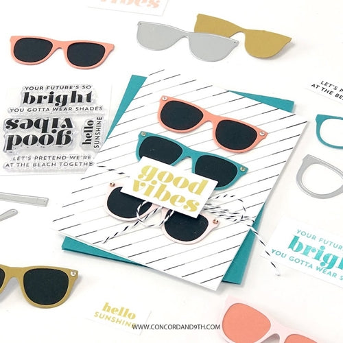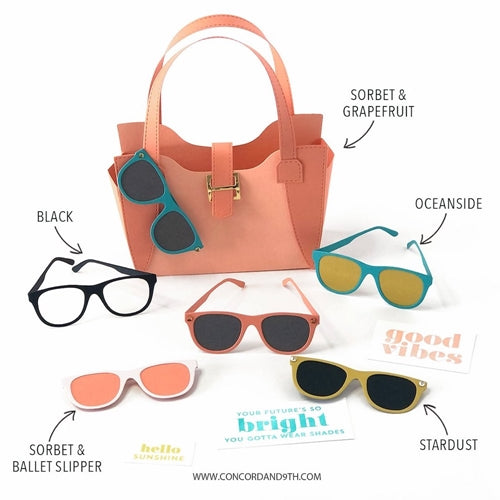 With the Bright Eyes Dies you can create an adorable little pair of sunglasses! Or regular glasses, if you want to go that route. The glasses can be used on a card front, or attach the arms to make a 3D pair of glasses that are the perfect accessory for the Weekender Handbag 11024! Pro tip: the glasses are sized just right to hang on the front of the handbag. Also coordinates with the Bright Eyes stamp set 11017.